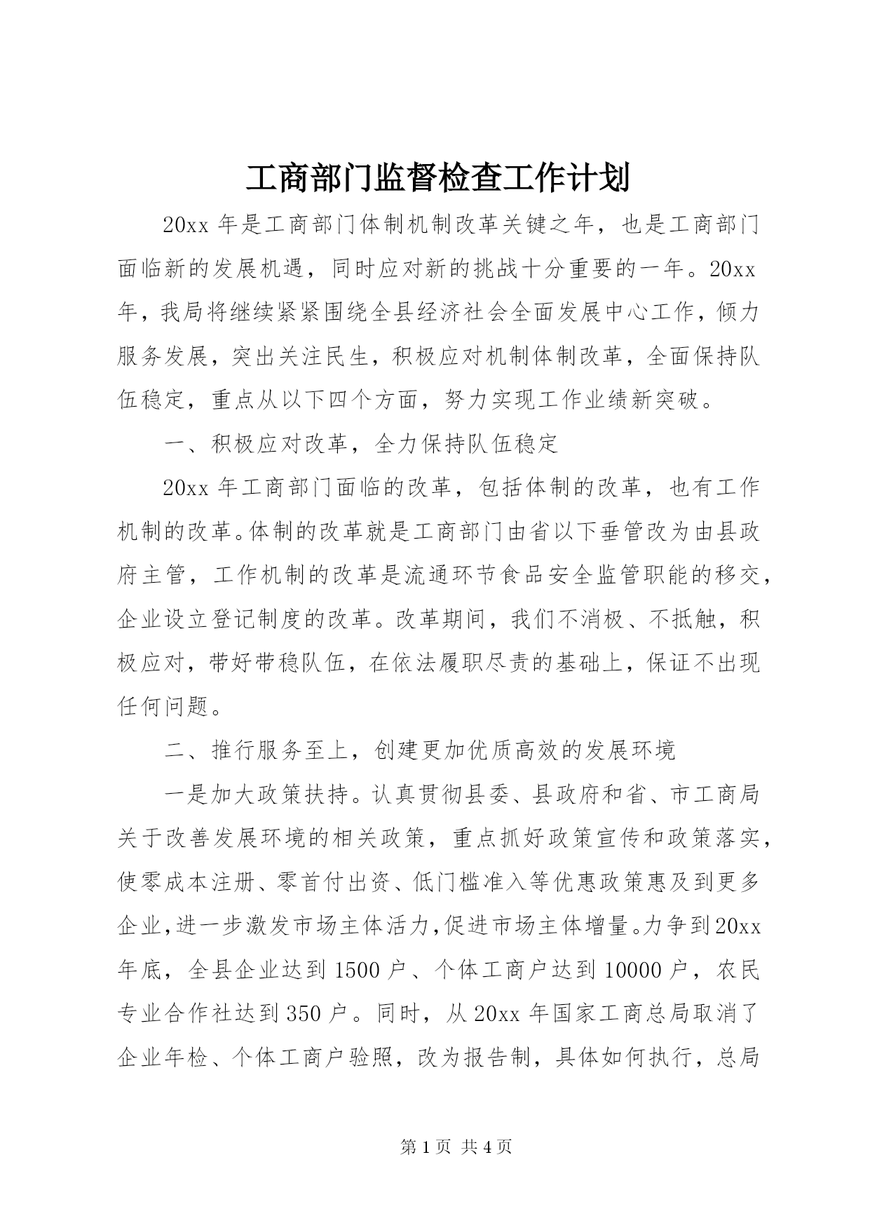 第PAGE\*Arabic\*MERGEFORMAT4页共NUMPAGES\*MERGEFORMAT4页工商部门监督检查工作计划20xx年是工商部门体制机制改革关键之年,也是工商部门面临新的发展机遇,同时应对新的挑战十分重要的一年。20xx年,我局将继续紧紧围绕全县经济社会全面发展中心工作,倾力服务发展,突出关注民生,积极应对机制体制改革,全面保持队伍稳定,重点从以下四个方面,努力实现工作业绩新突破。一、积极应对改革,全力保持队伍稳定20xx年工商部门面临的改革,包括体制的改革,也有工作机制的