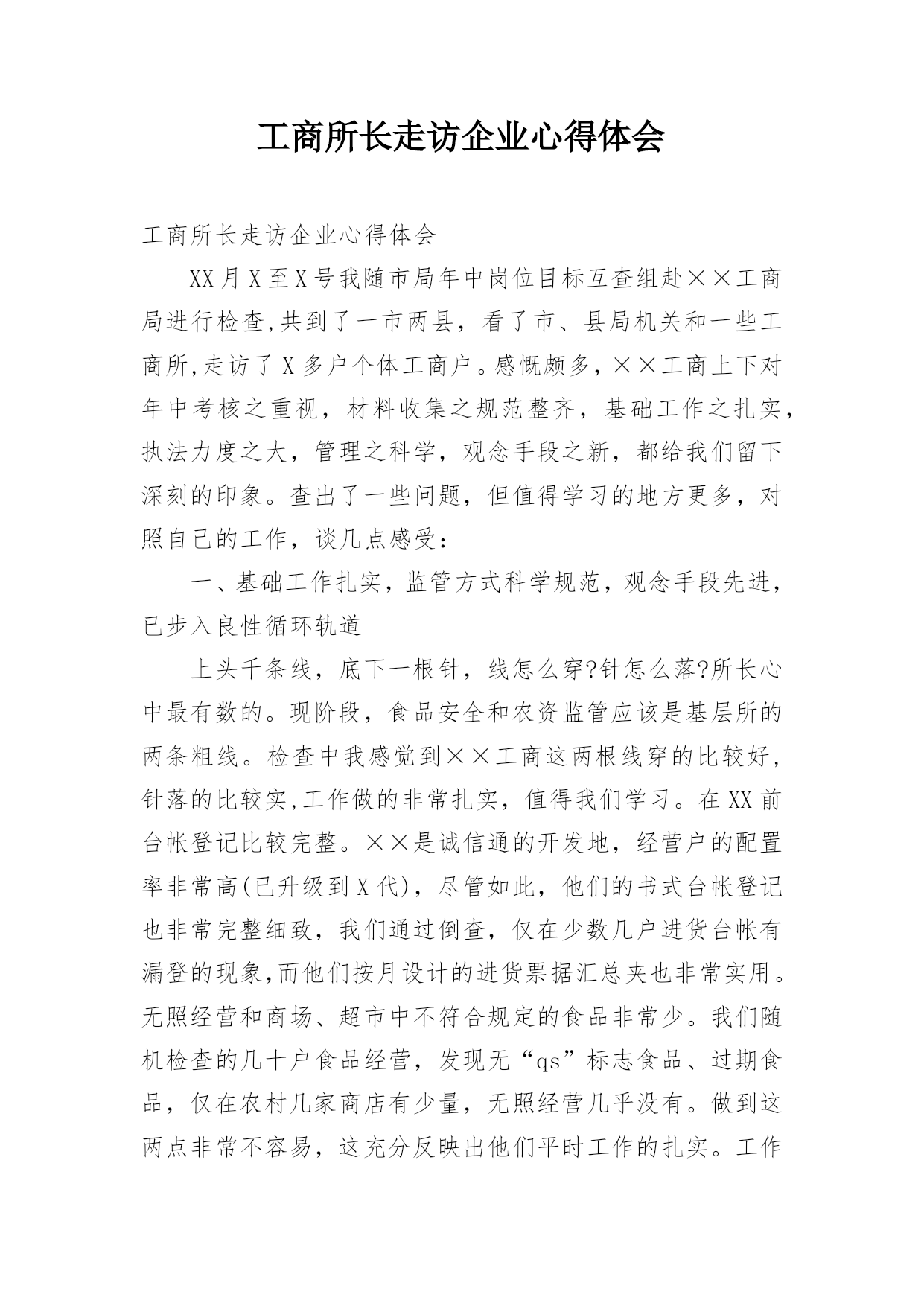 工商所长走访企业心得体会工商所长走访企业心得体会XX月X至X号我随市局年中岗位目标互查组赴××工商局进行检查,共到了一市两县,看了市、县局机关和一些工商所,走访了X多户个体工商户。感慨颇多,××工商上下对年中考核之重视,材料收集之规范整齐,基础工作之扎实,执法力度之大,管理之科学,观念手段之新,都给我们留下深刻的印象。查出了一些问题,但值得学习的地方更多,对照自己的工作,谈几点感受:一、基础工作扎实,监管方式科学规范,观念手段先进,已步入良性循环轨道上头千条线,底下一根针,线怎么穿?针怎么落?所长心中最有
