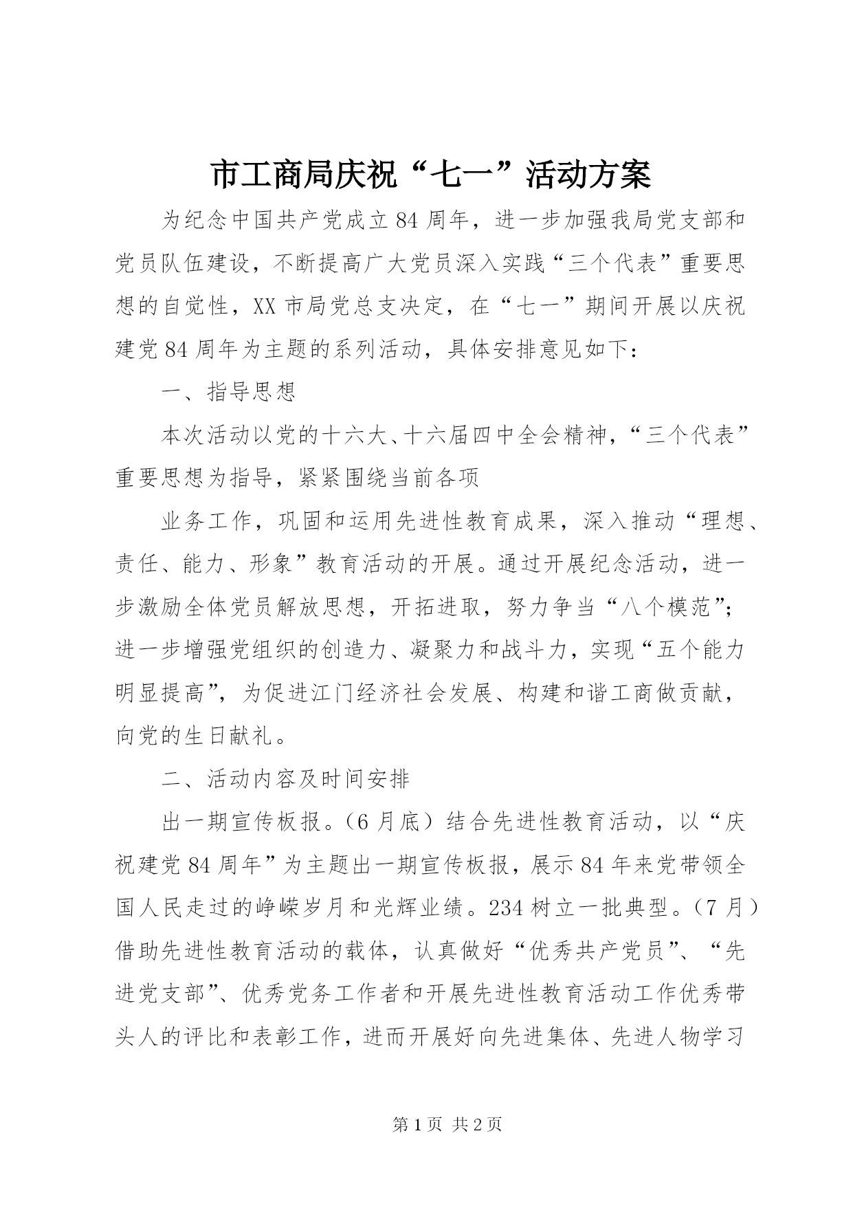 第PAGE\*Arabic\*MERGEFORMAT2页共NUMPAGES\*MERGEFORMAT2页市工商局庆祝“七一”活动方案为纪念中国共产党成立84周年,进一步加强我局党支部和党员队伍建设,不断提高广大党员深入实践“三个代表”重要思想的自觉性,XX市局党总支决定,在“七一”期间开展以庆祝建党84周年为主题的系列活动,具体安排意见如下:一、指导思想本次活动以党的十六大、十六届四中全会精神,“三个代表”重要思想为指导,紧紧围绕当前各项业务工作,巩固和运用先进性教育成果,深入推动“理想、责任