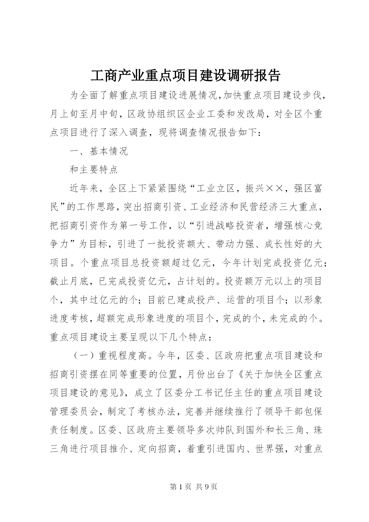 第PAGE\*Arabic\*MERGEFORMAT9页共NUMPAGES\*MERGEFORMAT9页工商产业重点项目建设调研报告为全面了解重点项目建设进展情况,加快重点项目建设步伐,月上旬至月中旬,区政协组织区企业工委和发改局,对全区个重点项目进行了深入调查,现将调查情况报告如下:一、基本情况和主要特点近年来,全区上下紧紧围绕“工业立区,振兴××,强区富民”的工作思路,突出招商引资、工业经济和民营经济三大重点,把招商引资作为第一号工作,以“引进战略投资者,增强核心竞争力”为目标,引进了一批