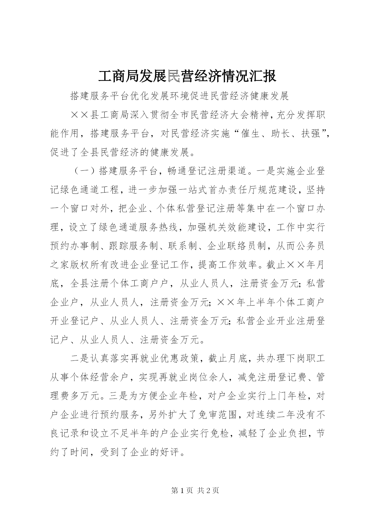 第PAGE\*Arabic\*MERGEFORMAT2页共NUMPAGES\*MERGEFORMAT2页工商局发展民营经济情况汇报搭建服务平台优化发展环境促进民营经济健康发展××县工商局深入贯彻全市民营经济大会精神,充分发挥职能作用,搭建服务平台,对民营经济实施“催生、助长、扶强”,促进了全县民营经济的健康发展。(一)搭建服务平台,畅通登记注册渠道。一是实施企业登记绿色通道工程,进一步加强一站式首办责任厅规范建设,坚持一个窗口对外,把企业、个体私营登记注册等集中在一个窗口办理,设立了绿色通道服