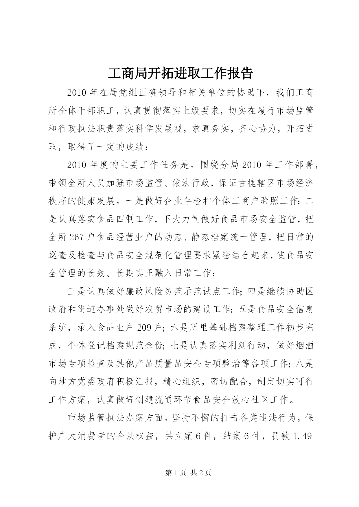第PAGE\*Arabic\*MERGEFORMAT2页共NUMPAGES\*MERGEFORMAT2页工商局开拓进取工作报告2010年在局党组正确领导和相关单位的协助下,我们工商所全体干部职工,认真贯彻落实上级要求,切实在履行市场监管和行政执法职责落实科学发展观,求真务实,齐心协力,开拓进取,取得了一定的成绩:2010年度的主要工作任务是。围绕分局2010年工作部署,带领全所人员加强市场监管、依法行政,保证古槐辖区市场经济秩序的健康发展。一是做好企业年检和个体工商户验照工作;二是认真落实食品