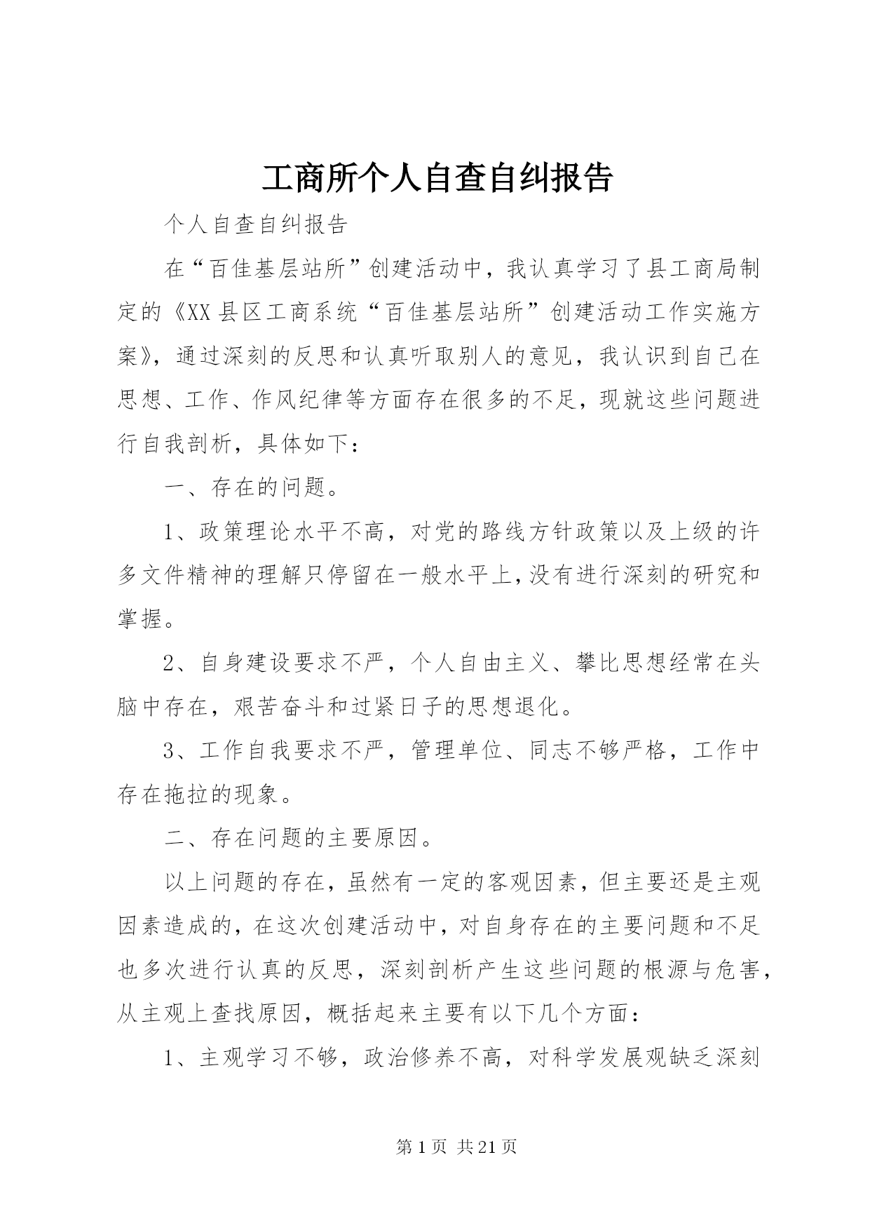第PAGE\*Arabic\*MERGEFORMAT21页共NUMPAGES\*MERGEFORMAT21页工商所个人自查自纠报告个人自查自纠报告在“百佳基层站所”创建活动中,我认真学习了县工商局制定的《XX县区工商系统“百佳基层站所”创建活动工作实施方案》,通过深刻的反思和认真听取别人的意见,我认识到自己在思想、工作、作风纪律等方面存在很多的不足,现就这些问题进行自我剖析,具体如下:一、存在的问题。1、政策理论水平不高,对党的路线方针政策以及上级的许多文件精神的理解只停留在一般水平上,没有进