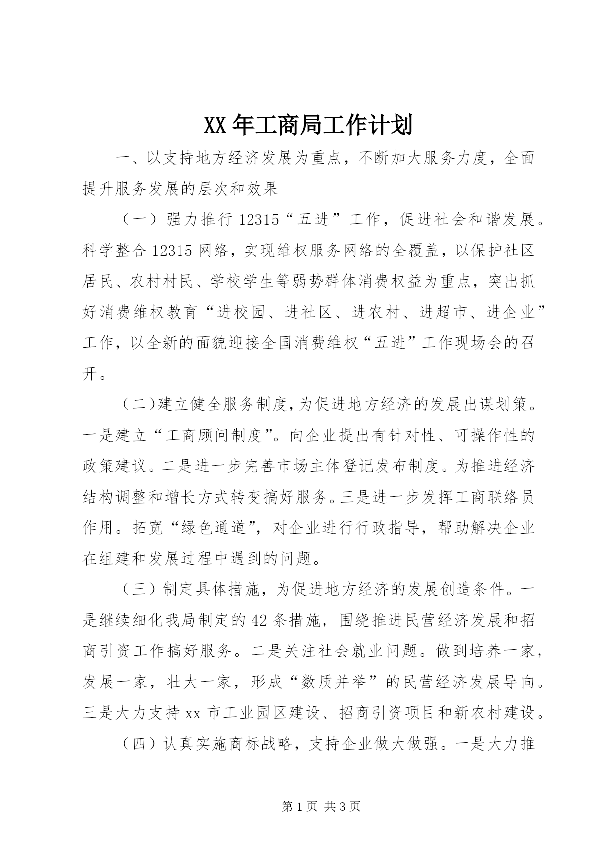 第PAGE\*Arabic\*MERGEFORMAT3页共NUMPAGES\*MERGEFORMAT3页XX年工商局工作计划一、以支持地方经济发展为重点,不断加大服务力度,全面提升服务发展的层次和效果(一)强力推行12315“五进”工作,促进社会和谐发展。科学整合12315网络,实现维权服务网络的全覆盖,以保护社区居民、农村村民、学校学生等弱势群体消费权益为重点,突出抓好消费维权教育“进校园、进社区、进农村、进超市、进企业”工作,以全新的面貌迎接全国消费维权“五进”工作现场会的召开。(二)建立