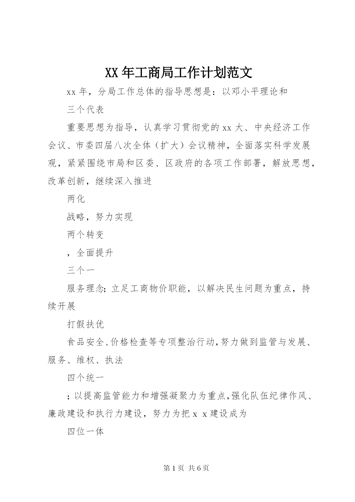 第PAGE\*Arabic\*MERGEFORMAT6页共NUMPAGES\*MERGEFORMAT6页XX年工商局工作计划范文xx年,分局工作总体的指导思想是:以邓小平理论和三个代表重要思想为指导,认真学习贯彻党的xx大、中央经济工作会议、市委四届八次全体(扩大)会议精神,全面落实科学发展观,紧紧围绕市局和区委、区政府的各项工作部署,解放思想,改革创新,继续深入推进两化战略,努力实现两个转变,全面提升三个一服务理念;立足工商物价职能,以解决民生问题为重点,持续开展打假扶优食品安全、价格检查等