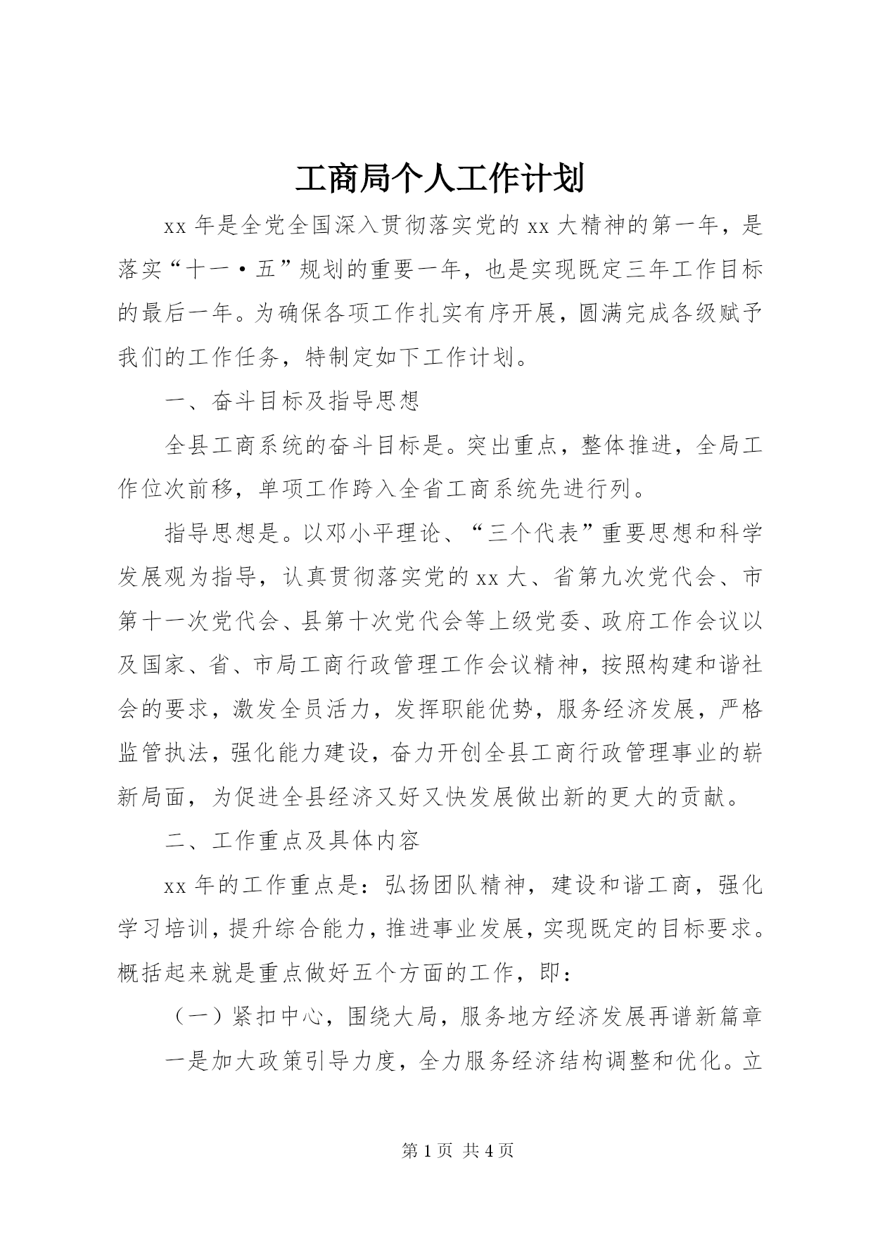 第PAGE\*Arabic\*MERGEFORMAT4页共NUMPAGES\*MERGEFORMAT4页工商局个人工作计划xx年是全党全国深入贯彻落实党的xx大精神的第一年,是落实“十一·五”规划的重要一年,也是实现既定三年工作目标的最后一年。为确保各项工作扎实有序开展,圆满完成各级赋予我们的工作任务,特制定如下工作计划。一、奋斗目标及指导思想全县工商系统的奋斗目标是。突出重点,整体推进,全局工作位次前移,单项工作跨入全省工商系统先进行列。指导思想是。以邓小平理论、“三个代表”重要思想和科学发