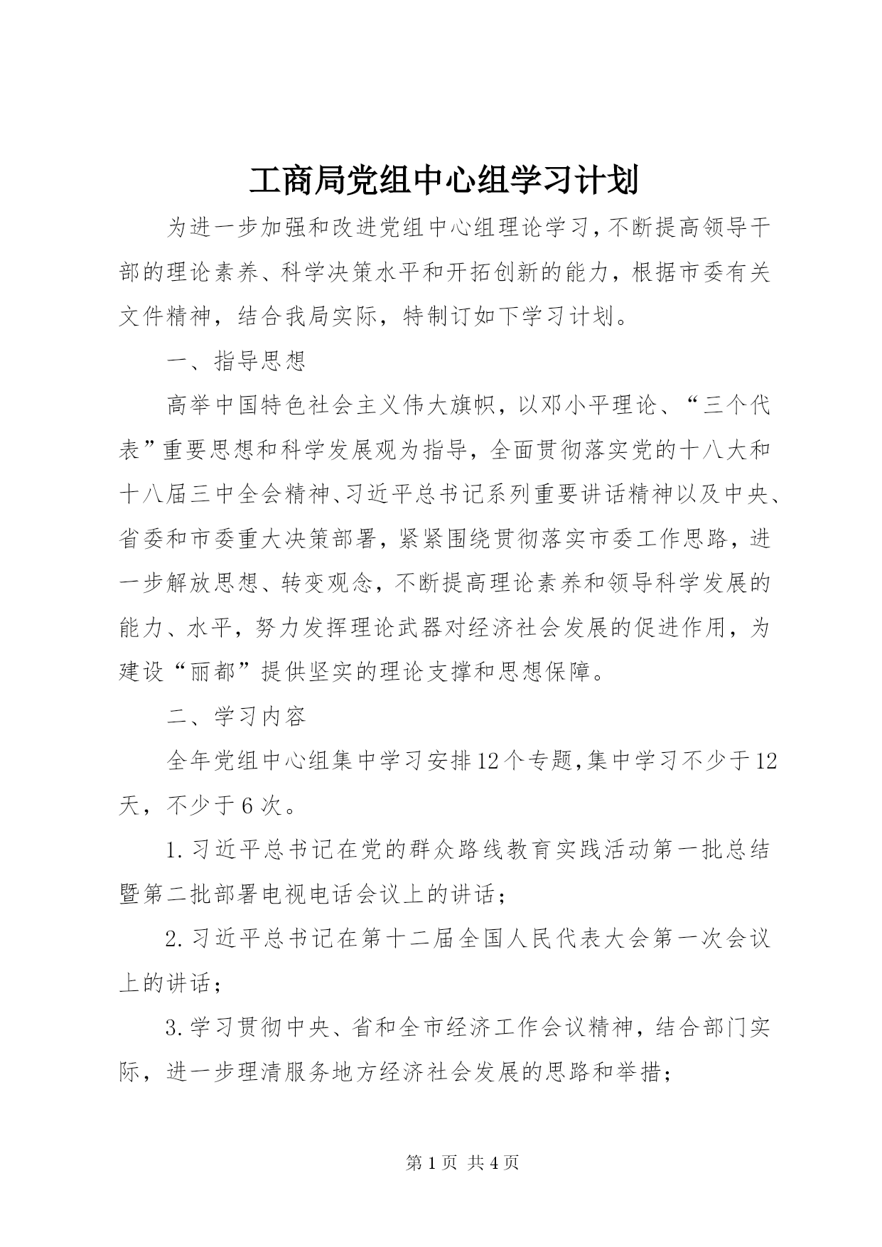 第PAGE\*Arabic\*MERGEFORMAT4页共NUMPAGES\*MERGEFORMAT4页工商局党组中心组学习计划为进一步加强和改进党组中心组理论学习,不断提高领导干部的理论素养、科学决策水平和开拓创新的能力,根据市委有关文件精神,结合我局实际,特制订如下学习计划。一、指导思想高举中国特色社会主义伟大旗帜,以邓小平理论、“三个代表”重要思想和科学发展观为指导,全面贯彻落实党的十八大和十八届三中全会精神、习近平总书记系列重要讲话精神以及中央、省委和市委重大决策部署,紧紧围绕贯彻落实