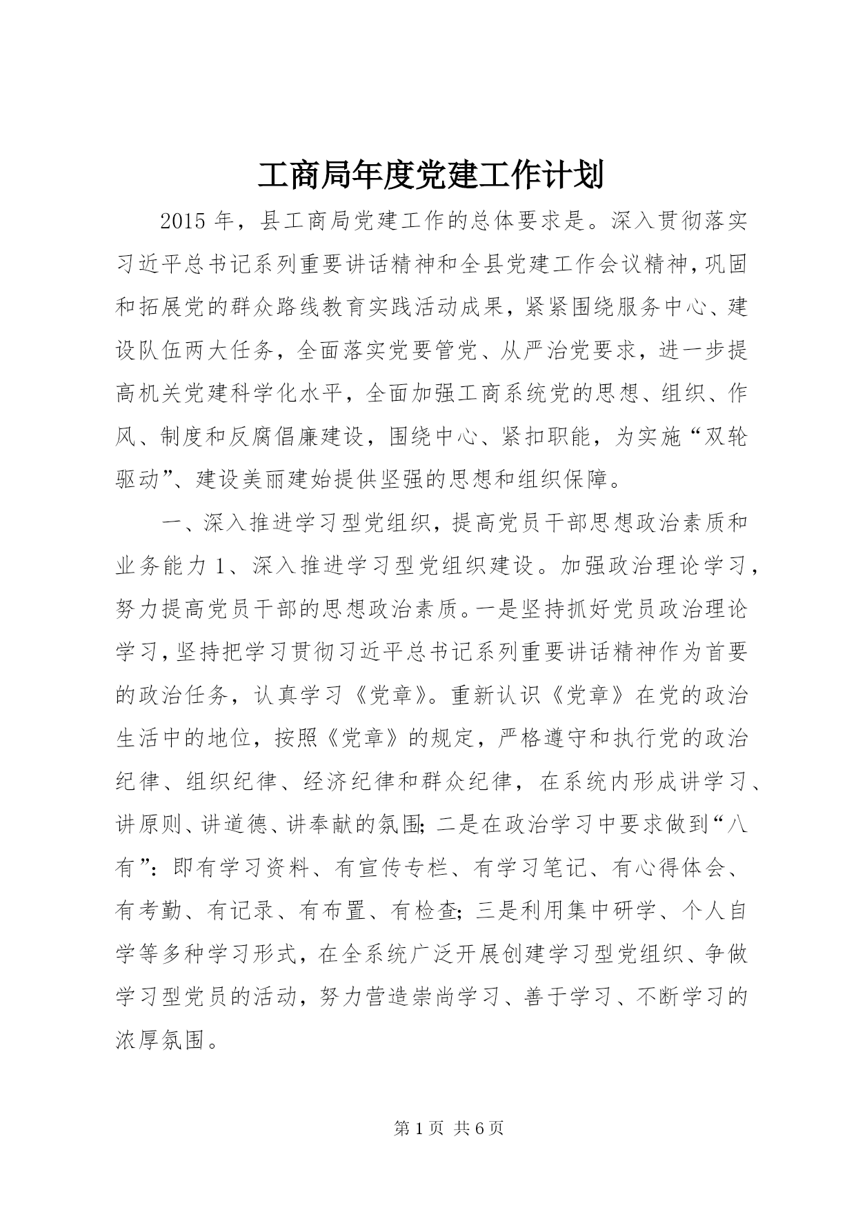 第PAGE\*Arabic\*MERGEFORMAT6页共NUMPAGES\*MERGEFORMAT6页工商局年度党建工作计划2015年,县工商局党建工作的总体要求是。深入贯彻落实习近平总书记系列重要讲话精神和全县党建工作会议精神,巩固和拓展党的群众路线教育实践活动成果,紧紧围绕服务中心、建设队伍两大任务,全面落实党要管党、从严治党要求,进一步提高机关党建科学化水平,全面加强工商系统党的思想、组织、作风、制度和反腐倡廉建设,围绕中心、紧扣职能,为实施“双轮驱动”、建设美丽建始提供坚强的思想和组