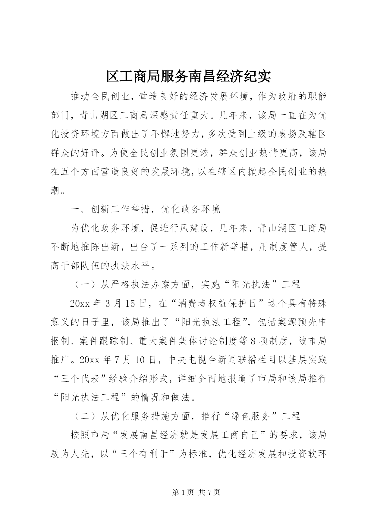 第PAGE\*Arabic\*MERGEFORMAT7页共NUMPAGES\*MERGEFORMAT7页区工商局服务南昌经济纪实推动全民创业,营造良好的经济发展环境,作为政府的职能部门,青山湖区工商局深感责任重大。几年来,该局一直在为优化投资环境方面做出了不懈地努力,多次受到上级的表扬及辖区群众的好评。为使全民创业氛围更浓,群众创业热情更高,该局在五个方面营造良好的发展环境,以在辖区内掀起全民创业的热潮。一、创新工作举措,优化政务环境为优化政务环境,促进行风建设,几年来,青山湖区工商局不断地推