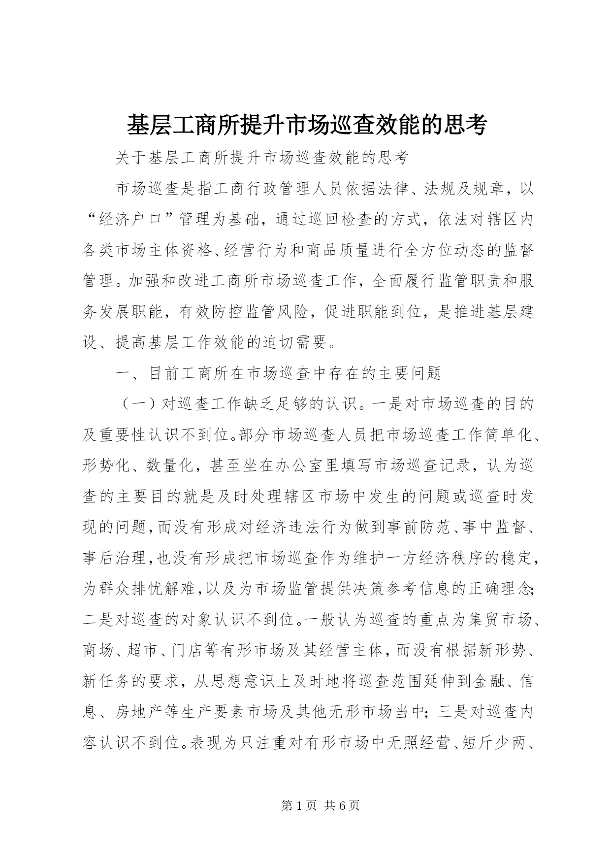 第PAGE\*Arabic\*MERGEFORMAT6页共NUMPAGES\*MERGEFORMAT6页基层工商所提升市场巡查效能的思考关于基层工商所提升市场巡查效能的思考市场巡查是指工商行政管理人员依据法律、法规及规章,以“经济户口”管理为基础,通过巡回检查的方式,依法对辖区内各类市场主体资格、经营行为和商品质量进行全方位动态的监督管理。加强和改进工商所市场巡查工作,全面履行监管职责和服务发展职能,有效防控监管风险,促进职能到位,是推进基层建设、提高基层工作效能的迫切需要。一、目前工商所在市