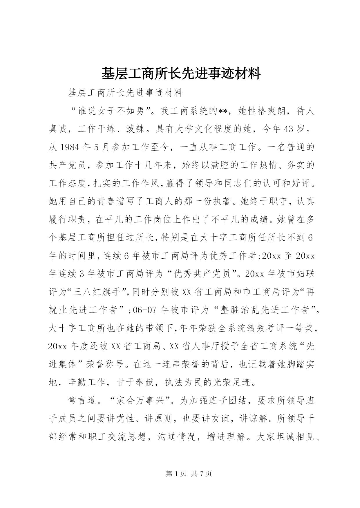 第PAGE\*Arabic\*MERGEFORMAT7页共NUMPAGES\*MERGEFORMAT7页基层工商所长先进事迹材料基层工商所长先进事迹材料“谁说女子不如男”。我工商系统的**,她性格爽朗,待人真诚,工作干练、泼辣。具有大学文化程度的她,今年43岁。从1984年5月参加工作至今,一直从事工商工作。一名普通的共产党员,参加工作十几年来,始终以满腔的工作热情、务实的工作态度,扎实的工作作风,赢得了领导和同志们的认可和好评。她用自己的青春谱写了工商人的那一份执著。她终于职守,认真履行职责
