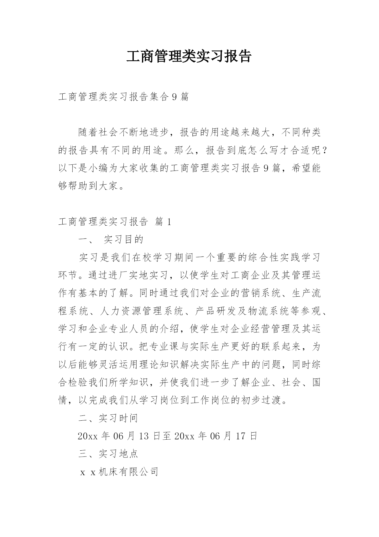 工商管理类实习报告工商管理类实习报告集合9篇随着社会不断地进步,报告的用途越来越大,不同种类的报告具有不同的用途。那么,报告到底怎么写才合适呢?以下是小编为大家收集的工商管理类实习报告9篇,希望能够帮助到大家。工商管理类实习报告篇1一、实习目的实习是我们在校学习期间一个重要的综合性实践学习环节。通过进厂实地实习,以使学生对工商企业及其管理运作有基本的了解。同时通过我们对企业的营销系统、生产流程系统、人力资源管理系统、产品研发及物流系统等参观、学习和企业专业人员的介绍,使学生对企业经营管理及其运行有一定的认