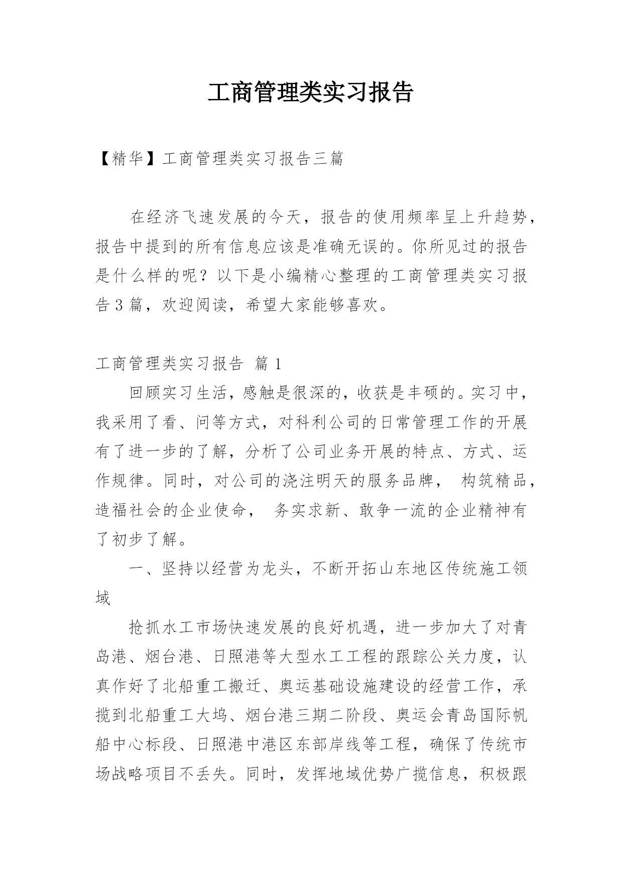 工商管理类实习报告【精华】工商管理类实习报告三篇在经济飞速发展的今天,报告的使用频率呈上升趋势,报告中提到的所有信息应该是准确无误的。你所见过的报告是什么样的呢?以下是小编精心整理的工商管理类实习报告3篇,欢迎阅读,希望大家能够喜欢。工商管理类实习报告篇1回顾实习生活,感触是很深的,收获是丰硕的。实习中,我采用了看、问等方式,对科利公司的日常管理工作的开展有了进一步的了解,分析了公司业务开展的特点、方式、运作规律。同时,对公司的浇注明天的服务品牌,构筑精品,造福社会的企业使命,务实求新、敢争一流的企业精神
