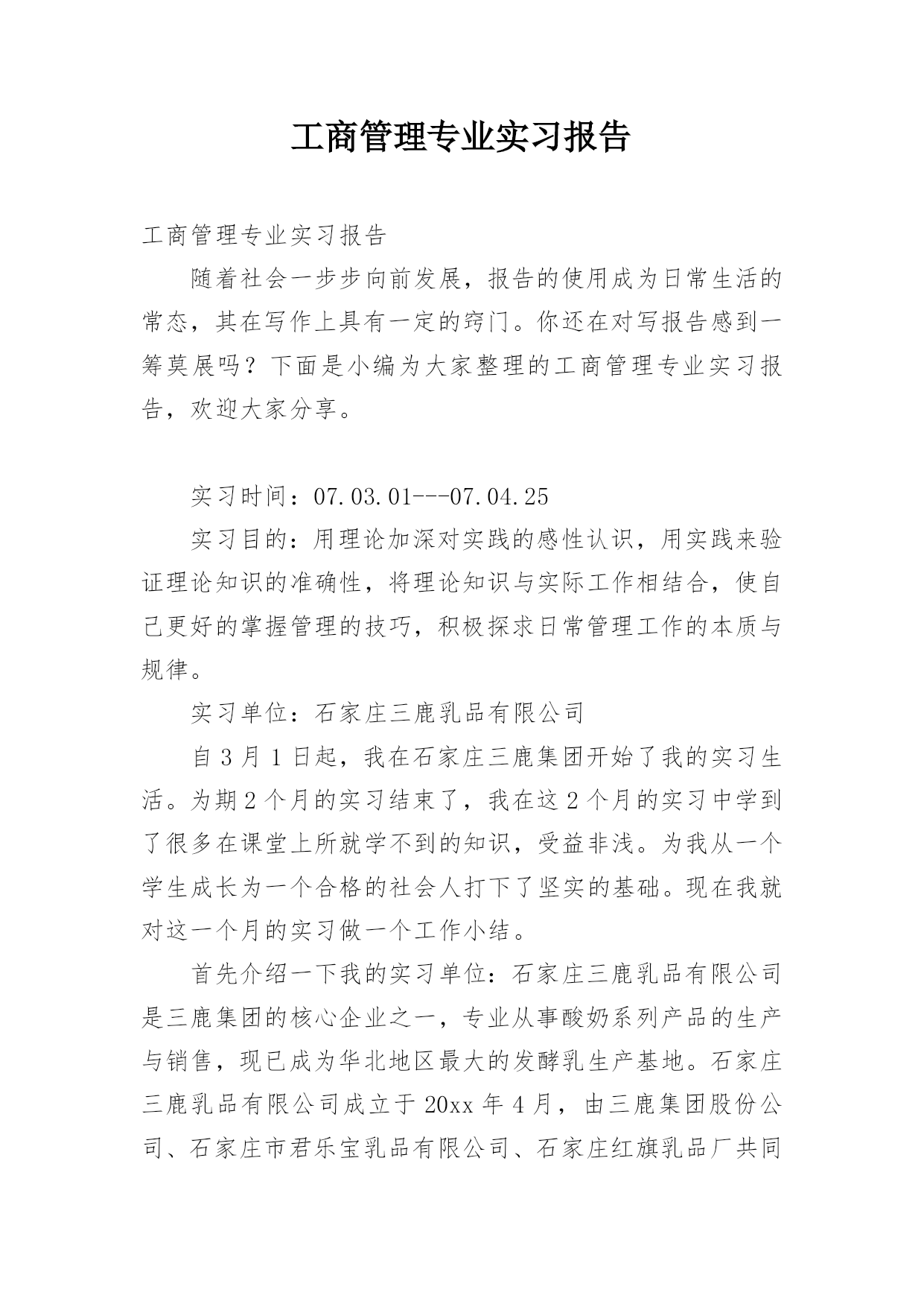 工商管理专业实习报告工商管理专业实习报告随着社会一步步向前发展,报告的使用成为日常生活的常态,其在写作上具有一定的窍门。你还在对写报告感到一筹莫展吗?下面是小编为大家整理的工商管理专业实习报告,欢迎大家分享。实习时间:07.03.01---07.04.25实习目的:用理论加深对实践的感性认识,用实践来验证理论知识的准确性,将理论知识与实际工作相结合,使自己更好的掌握管理的技巧,积极探求日常管理工作的本质与规律。实习单位:石家庄三鹿乳品有限公司自3月1日起,我在石家庄三鹿集团开始了我的实习生活。为期2个月的