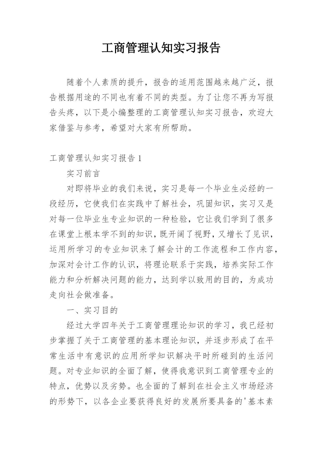 工商管理认知实习报告随着个人素质的提升,报告的适用范围越来越广泛,报告根据用途的不同也有着不同的类型。为了让您不再为写报告头疼,以下是小编整理的工商管理认知实习报告,欢迎大家借鉴与参考,希望对大家有所帮助。工商管理认知实习报告1实习前言对即将毕业的我们来说,实习是每一个毕业生必经的一段经历,它使我们在实践中了解社会,巩固知识,实习又是对每一位毕业生专业知识的一种检验,它让我们学到了很多在课堂上根本学不到的知识,既开阔了视野,又增长了见识,运用所学习的专业知识来了解会计的工作流程和工作内容,加深对会计工作的