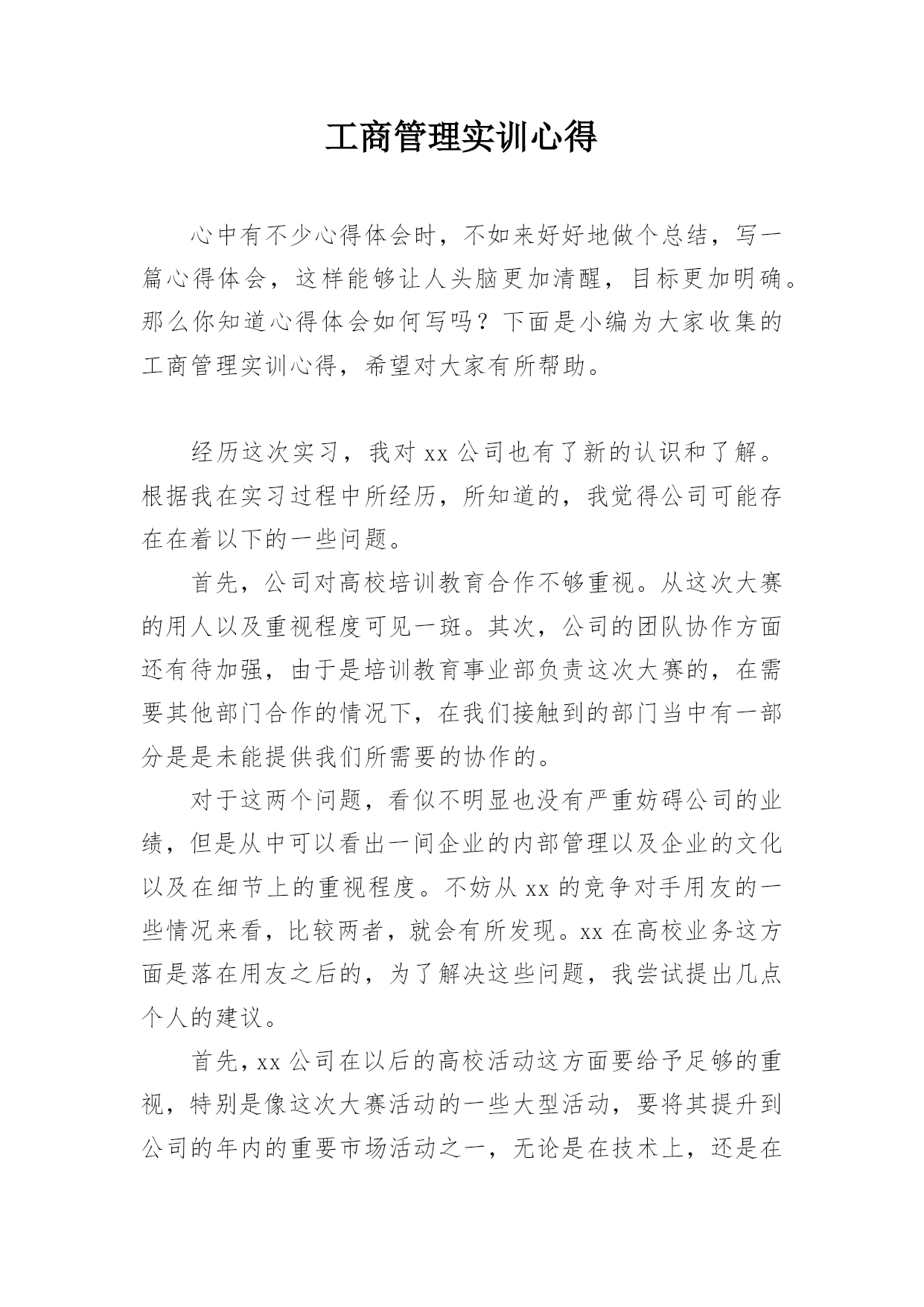 工商管理实训心得心中有不少心得体会时,不如来好好地做个总结,写一篇心得体会,这样能够让人头脑更加清醒,目标更加明确。那么你知道心得体会如何写吗?下面是小编为大家收集的工商管理实训心得,希望对大家有所帮助。经历这次实习,我对xx公司也有了新的认识和了解。根据我在实习过程中所经历,所知道的,我觉得公司可能存在在着以下的一些问题。首先,公司对高校培训教育合作不够重视。从这次大赛的用人以及重视程度可见一斑。其次,公司的团队协作方面还有待加强,由于是培训教育事业部负责这次大赛的,在需要其他部门合作的情况下,在我们接