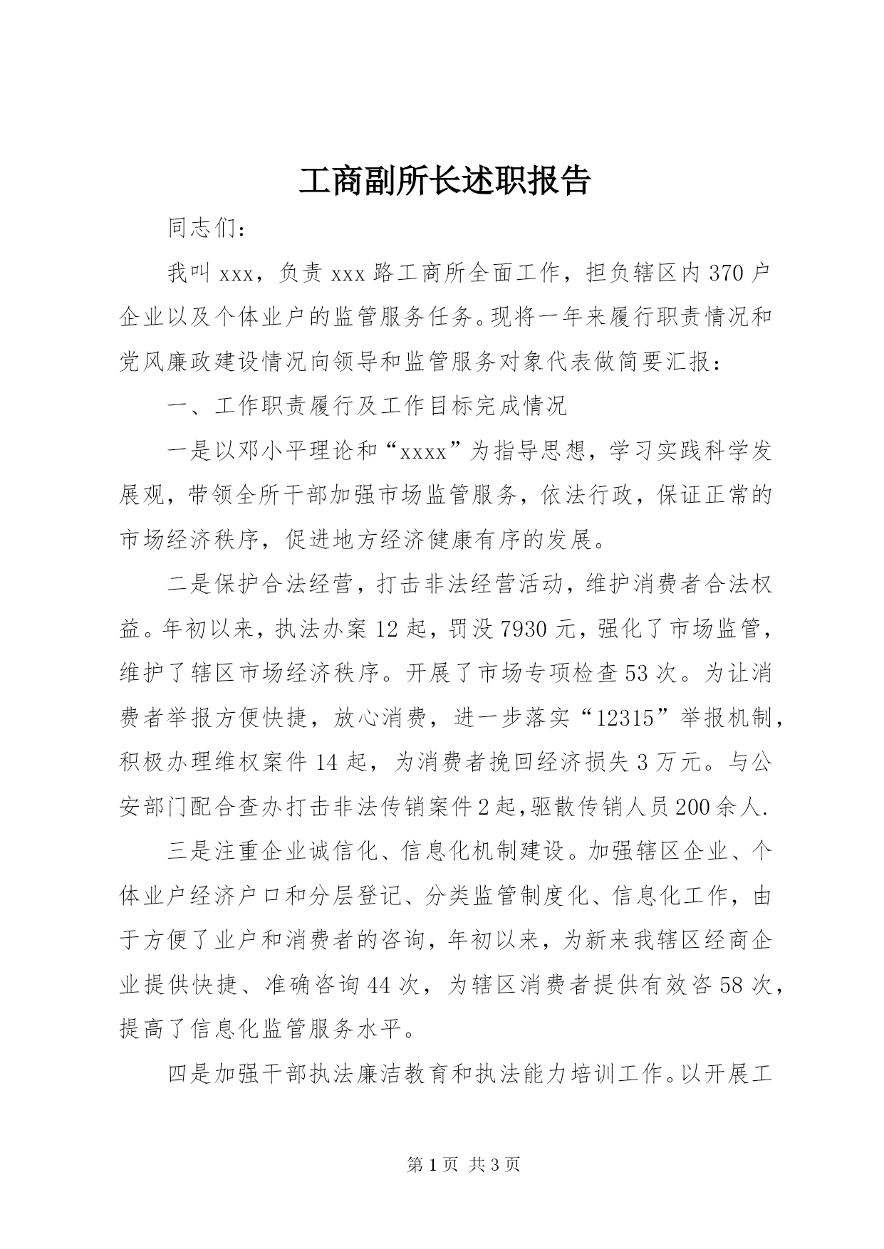 第PAGE\*Arabic\*MERGEFORMAT3页共NUMPAGES\*MERGEFORMAT3页工商副所长述职报告同志们:我叫xxx,负责xxx路工商所全面工作,担负辖区内370户企业以及个体业户的监管服务任务。现将一年来履行职责情况和党风廉政建设情况向领导和监管服务对象代表做简要汇报:一、工作职责履行及工作目标完成情况一是以邓小平理论和“xxxx”为指导思想,学习实践科学发展观,带领全所干部加强市场监管服务,依法行政,保证正常的市场经济秩序,促进地方经济健康有序的发展。二是保护合法经