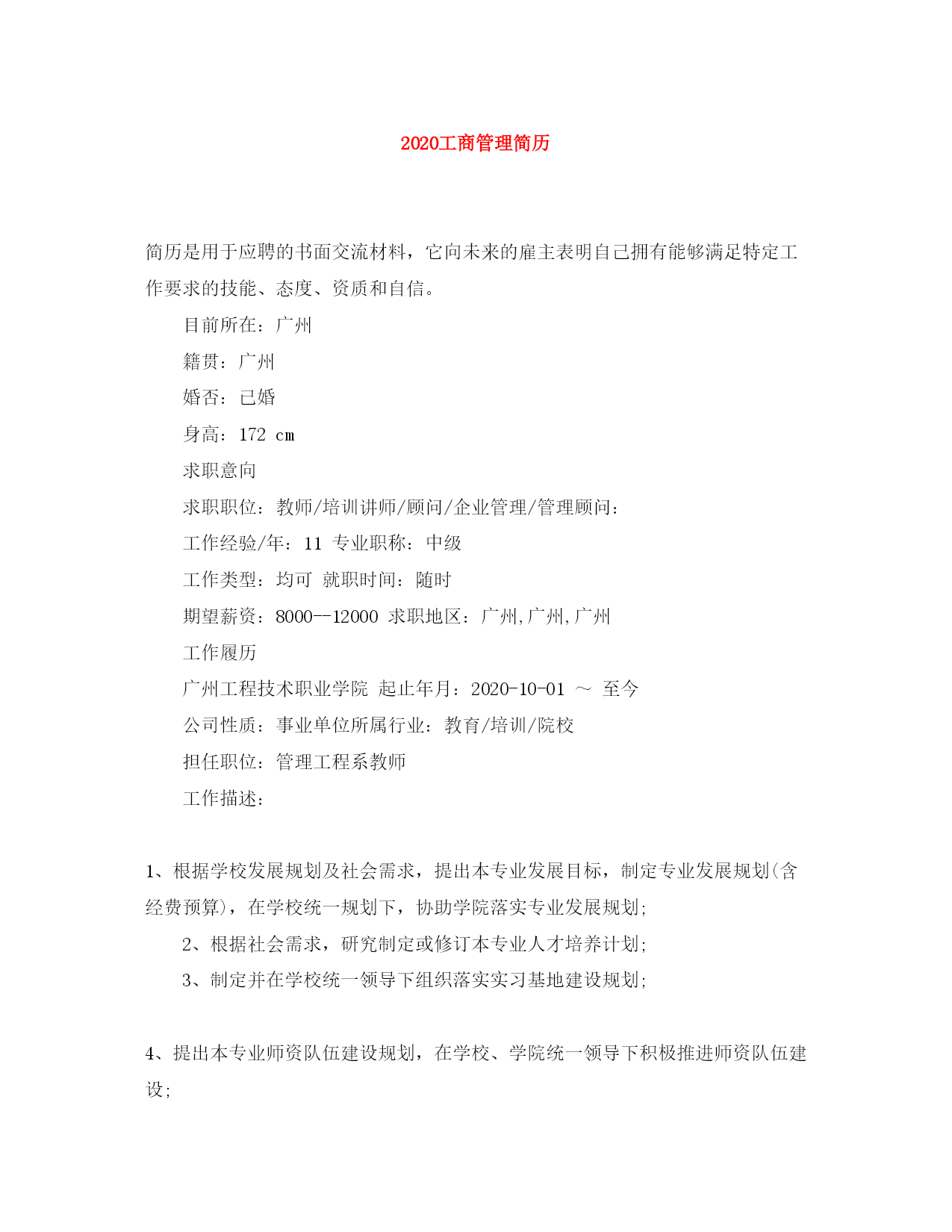 此资料由网络收集而来,如有侵权请告知上传者立即删除。资料共分享,我们负责传递知识。2020工商管理简历简历是用于应聘的书面交流材料,它向未来的雇主表明自己拥有能够满足特定工作要求的技能、态度、资质和自信。目前所在:广州籍贯:广州婚否:已婚身高:172cm求职意向求职职位:教师/培训讲师/顾问/企业管理/管理顾问:工作经验/年:11专业职称:中级工作类型:均可就职时间:随时期望薪资:8000--12000求职地区:广州,广州,广州工作履历广州工程技术职业学院起止年月:2020-10-01~至今公司性质:事业