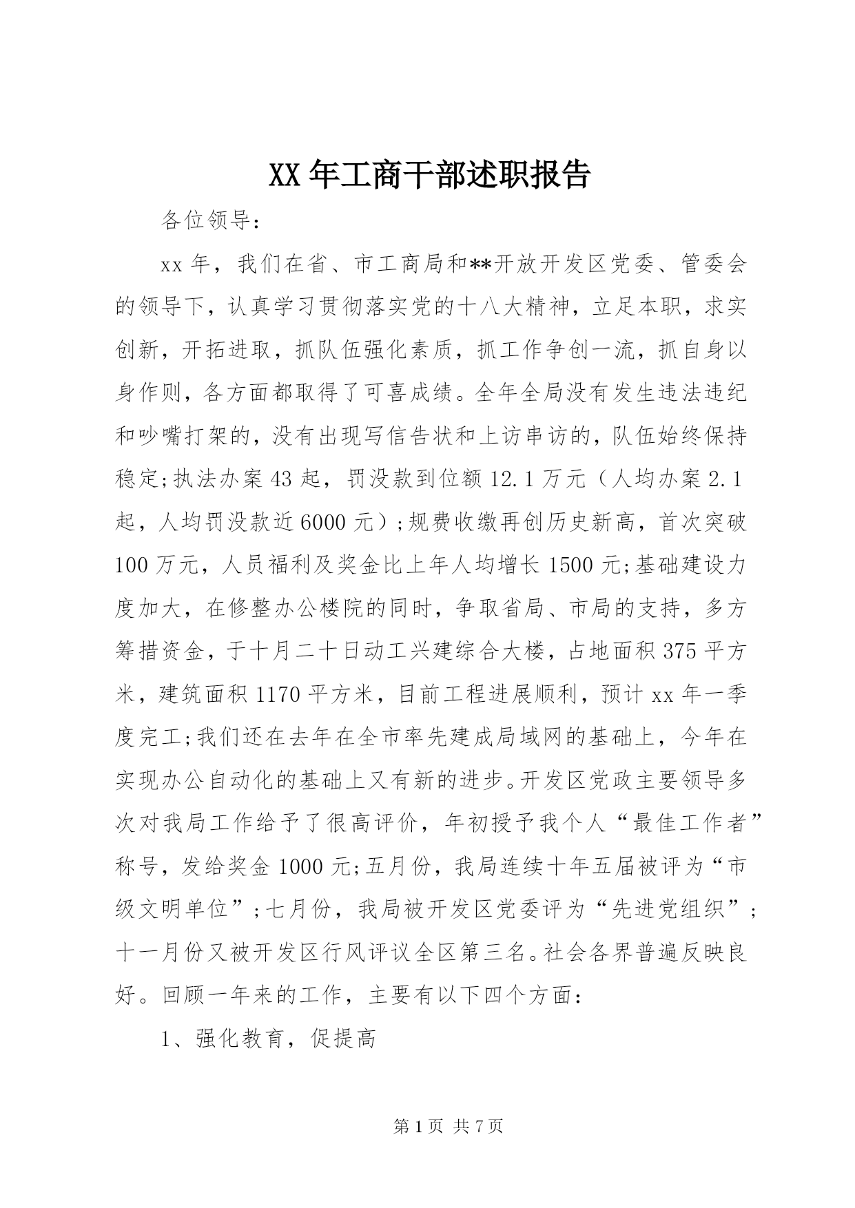 第PAGE\*Arabic\*MERGEFORMAT7页共NUMPAGES\*MERGEFORMAT7页XX年工商干部述职报告各位领导:xx年,我们在省、市工商局和**开放开发区党委、管委会的领导下,认真学习贯彻落实党的十八大精神,立足本职,求实创新,开拓进取,抓队伍强化素质,抓工作争创一流,抓自身以身作则,各方面都取得了可喜成绩。全年全局没有发生违法违纪和吵嘴打架的,没有出现写信告状和上访串访的,队伍始终保持稳定;执法办案43起,罚没款到位额12.1万元(人均办案2.1起,人均罚没款近600