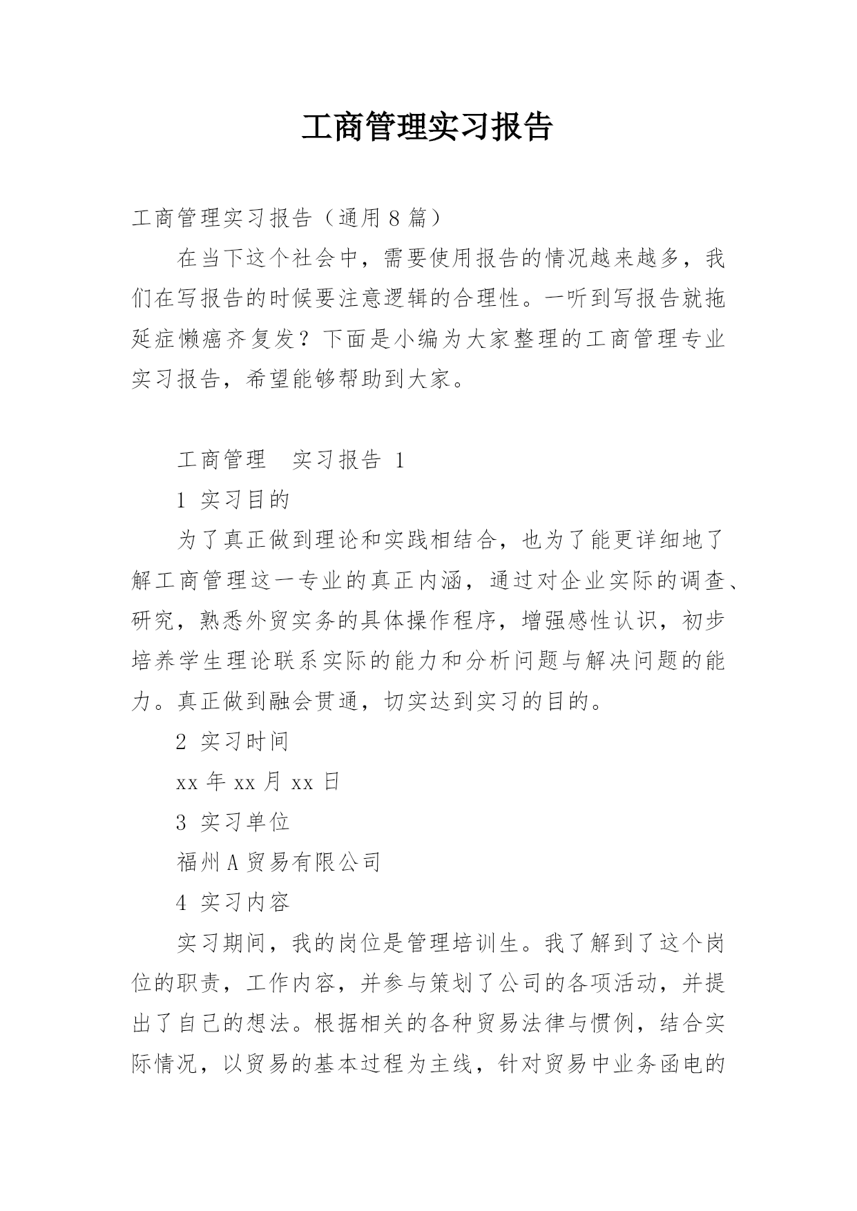 工商管理实习报告工商管理实习报告(通用8篇)在当下这个社会中,需要使用报告的情况越来越多,我们在写报告的时候要注意逻辑的合理性。一听到写报告就拖延症懒癌齐复发?下面是小编为大家整理的工商管理专业实习报告,希望能够帮助到大家。工商管理实习报告11实习目的为了真正做到理论和实践相结合,也为了能更详细地了解工商管理这一专业的真正内涵,通过对企业实际的调查、研究,熟悉外贸实务的具体操作程序,增强感性认识,初步培养学生理论联系实际的能力和分析问题与解决问题的能力。真正做到融会贯通,切实达到实习的目的。2实习时间xx