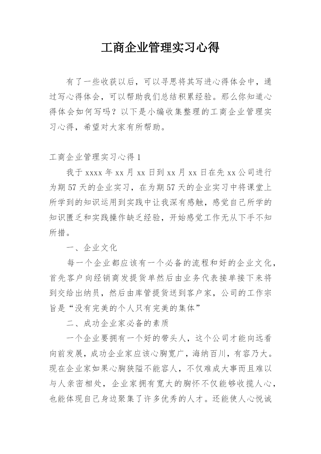 工商企业管理实习心得有了一些收获以后,可以寻思将其写进心得体会中,通过写心得体会,可以帮助我们总结积累经验。那么你知道心得体会如何写吗?以下是小编收集整理的工商企业管理实习心得,希望对大家有所帮助。工商企业管理实习心得1我于xxxx年xx月xx日到xx月xx日在先xx公司进行为期57天的企业实习,在为期57天的企业实习中将课堂上所学到的知识运用到实践中让我深有感触,感觉自己所学的知识匮乏和实践操作缺乏经验,开始感觉工作无从下手不知所措。一、企业文化每一个企业都应该有一个必备的流程和好的企业文化,首先客户向