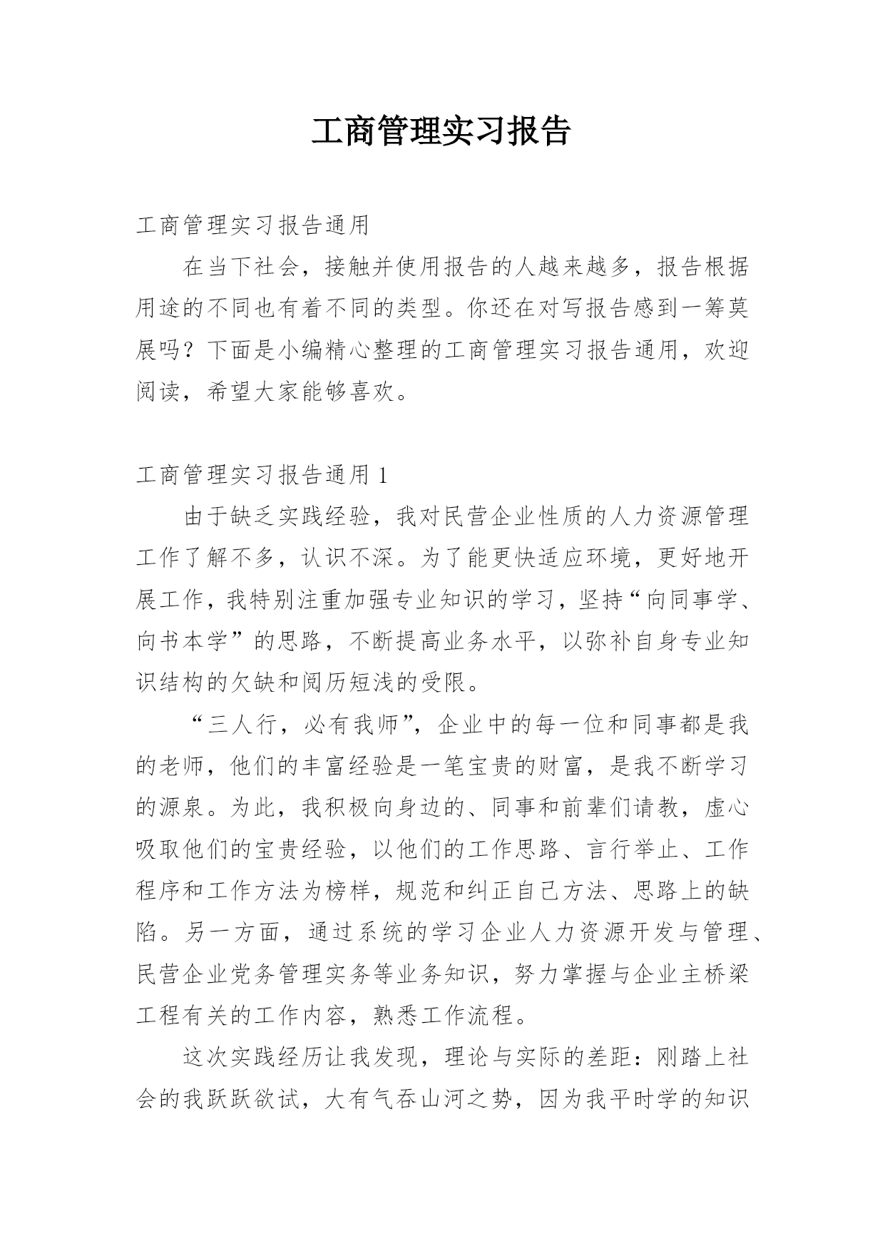 工商管理实习报告工商管理实习报告通用在当下社会,接触并使用报告的人越来越多,报告根据用途的不同也有着不同的类型。你还在对写报告感到一筹莫展吗?下面是小编精心整理的工商管理实习报告通用,欢迎阅读,希望大家能够喜欢。工商管理实习报告通用1由于缺乏实践经验,我对民营企业性质的人力资源管理工作了解不多,认识不深。为了能更快适应环境,更好地开展工作,我特别注重加强专业知识的学习,坚持“向同事学、向书本学”的思路,不断提高业务水平,以弥补自身专业知识结构的欠缺和阅历短浅的受限。“三人行,必有我师”,企业中的每一位和同