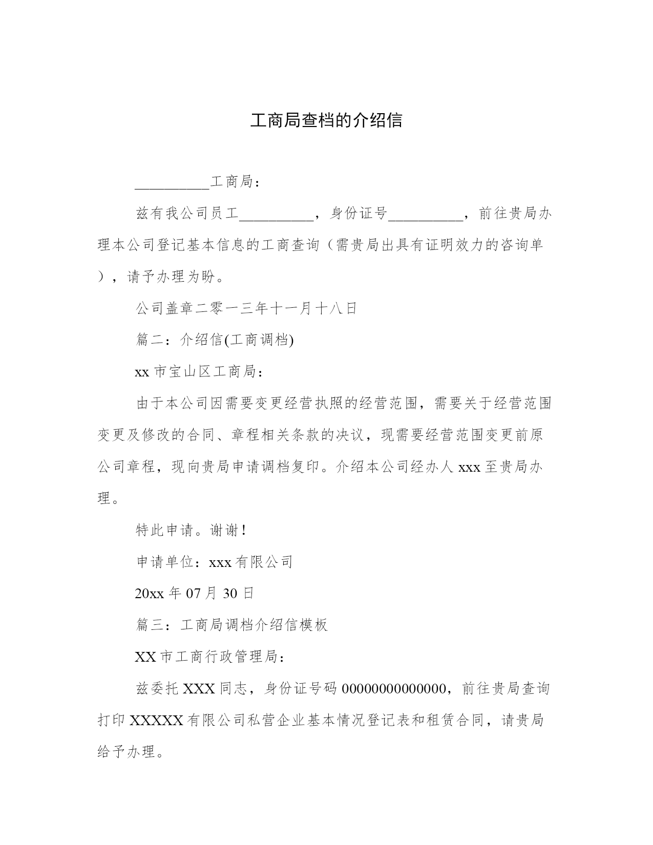 工商局查档的介绍信__________工商局:兹有我公司员工__________,身份证号__________,前往贵局办理本公司登记基本信息的工商查询(需贵局出具有证明效力的咨询单),请予办理为盼。公司盖章二零一三年十一月十八日篇二:介绍信(工商调档)xx市宝山区工商局:由于本公司因需要变更经营执照的经营范围,需要关于经营范围变更及修改的合同、章程相关条款的决议,现需要经营范围变更前原公司章程,现向贵局申请调档复印。介绍本公司经办人xxx至贵局办理。特此申请。谢谢!申请单位:xxx有限公司20xx年07
