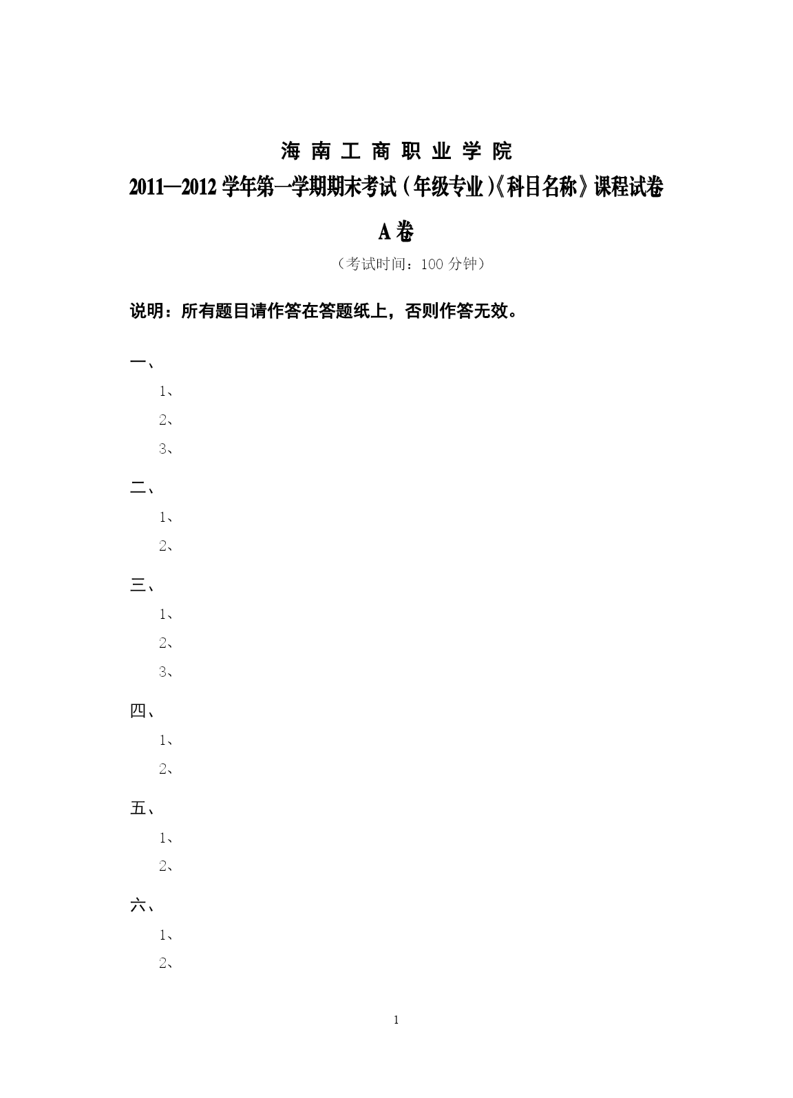 PAGEPAGE2海南工商职业学院2011—2012学年第一学期期末考试(年级专业)《科目名称》课程试卷A卷(考试时间:100分钟)说明:所有题目请作答在答题纸上,否则作答无效。一、1、2、3、二、1、2、三、1、2、3、四、1、2、五、1、2、六、1、2、七、1、2、注意:1、页面设置,16K(19.5*27);2、试卷头里要标明年级、专业和课程名称,课程名称要与系统一致;3、各个系(部)自建一个文件夹:下面再按照年级10级、11级建4个文件,再四个年级的文件夹下面再按照专业建文件夹,每个专