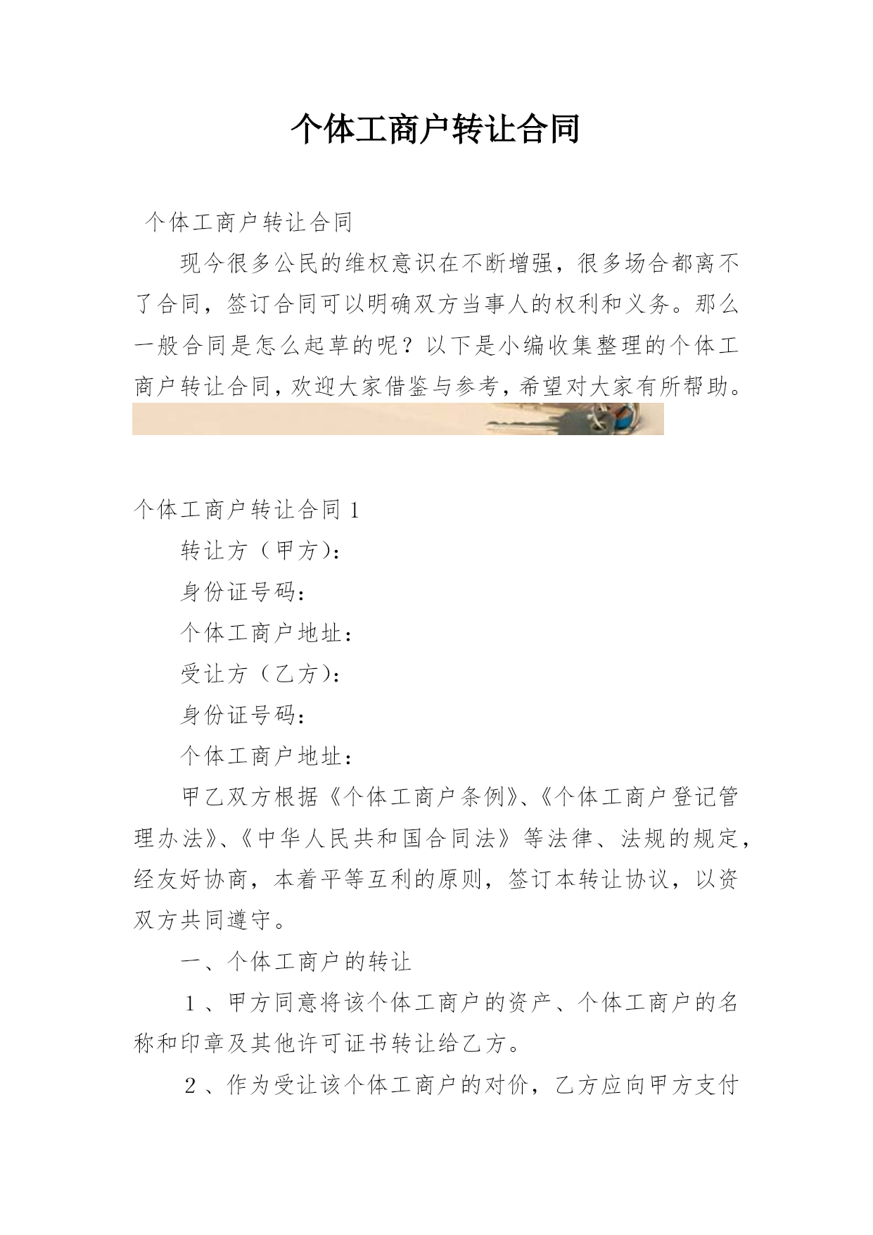 个体工商户转让合同个体工商户转让合同现今很多公民的维权意识在不断增强,很多场合都离不了合同,签订合同可以明确双方当事人的权利和义务。那么一般合同是怎么起草的呢?以下是小编收集整理的个体工商户转让合同,欢迎大家借鉴与参考,希望对大家有所帮助。个体工商户转让合同1转让方(甲方):身份证号码:个体工商户地址:受让方(乙方):身份证号码:个体工商户地址:甲乙双方根据《个体工商户条例》、《个体工商户登记管理办法》、《中华人民共和国合同法》等法律、法规的规定,经友好协商,本着平等互利的原则,签订本转让协议,以资双方共