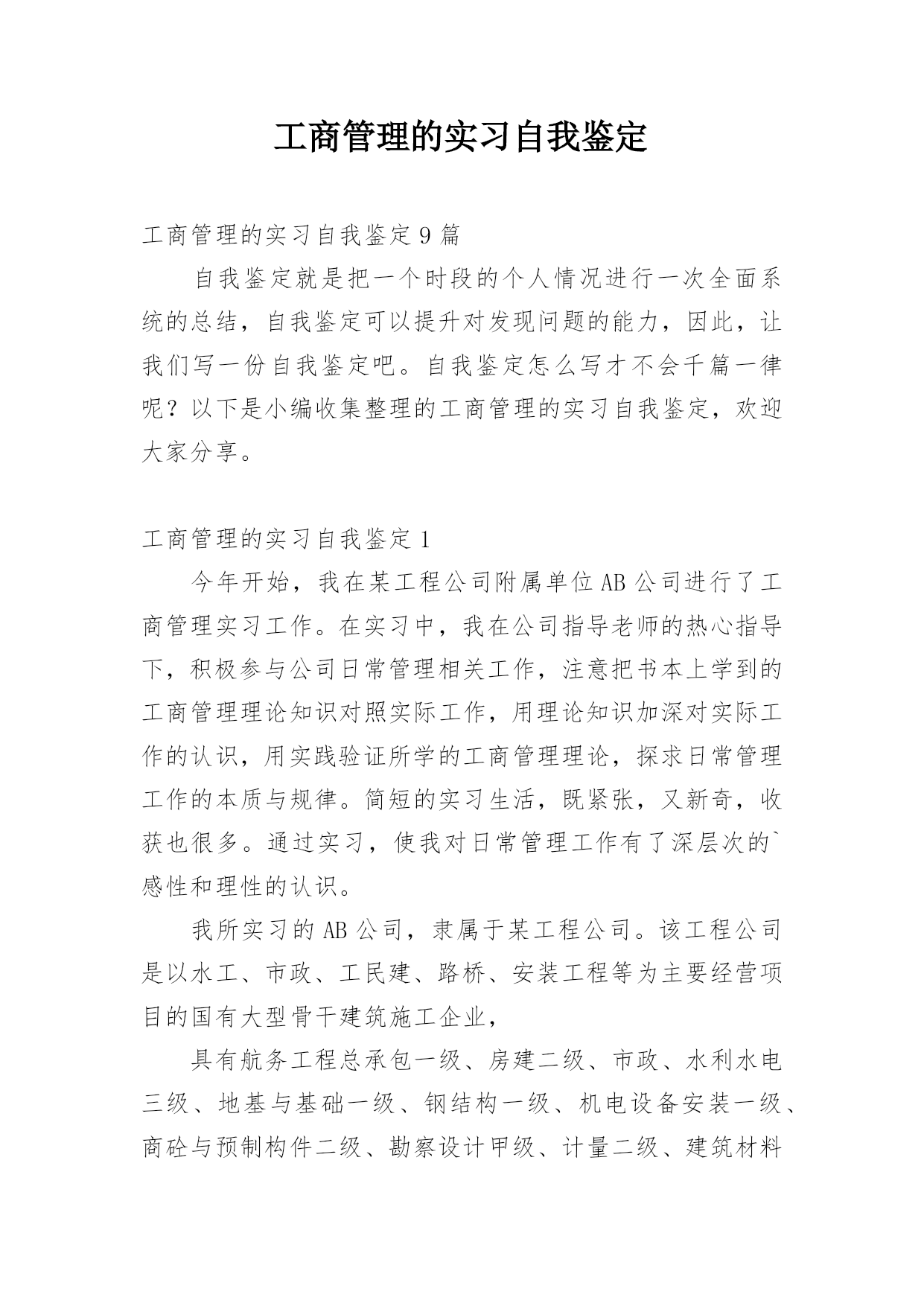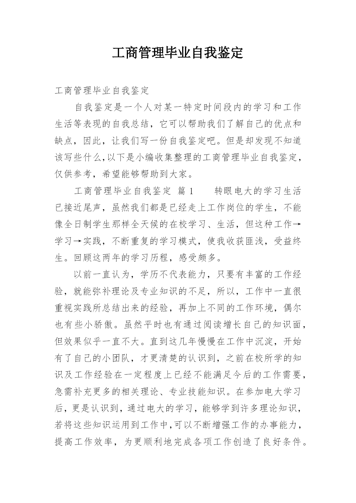工商管理毕业自我鉴定工商管理毕业自我鉴定自我鉴定是一个人对某一特定时间段内的学习和工作生活等表现的自我总结,它可以帮助我们了解自己的优点和缺点,因此,让我们写一份自我鉴定吧。但是却发现不知道该写些什么,以下是小编收集整理的工商管理毕业自我鉴定,仅供参考,希望能够帮助到大家。工商管理毕业自我鉴定篇1转眼电大的学习生活已接近尾声,虽然我们都是已经走上工作岗位的学生,不能像全日制学生那样全天候的在校学习、生活,但这种工作→学习→实践,不断重复的学习模式,使我收获匪浅,受益终生。回顾这两年的学习历程,感受颇多。以