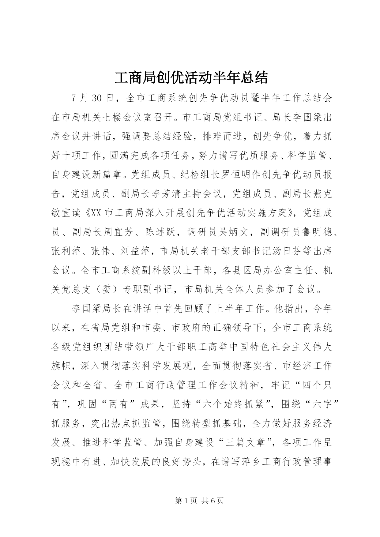 第PAGE\*Arabic\*MERGEFORMAT6页共NUMPAGES\*MERGEFORMAT6页工商局创优活动半年总结7月30日,全市工商系统创先争优动员暨半年工作总结会在市局机关七楼会议室召开。市工商局党组书记、局长李国梁出席会议并讲话,强调要总结经验,排难而进,创先争优,着力抓好十项工作,圆满完成各项任务,努力谱写优质服务、科学监管、自身建设新篇章。党组成员、纪检组长罗恒明作创先争优动员报告,党组成员、副局长李芳清主持会议,党组成员、副局长燕克敏宣读《XX市工商局深入开展创先争优活