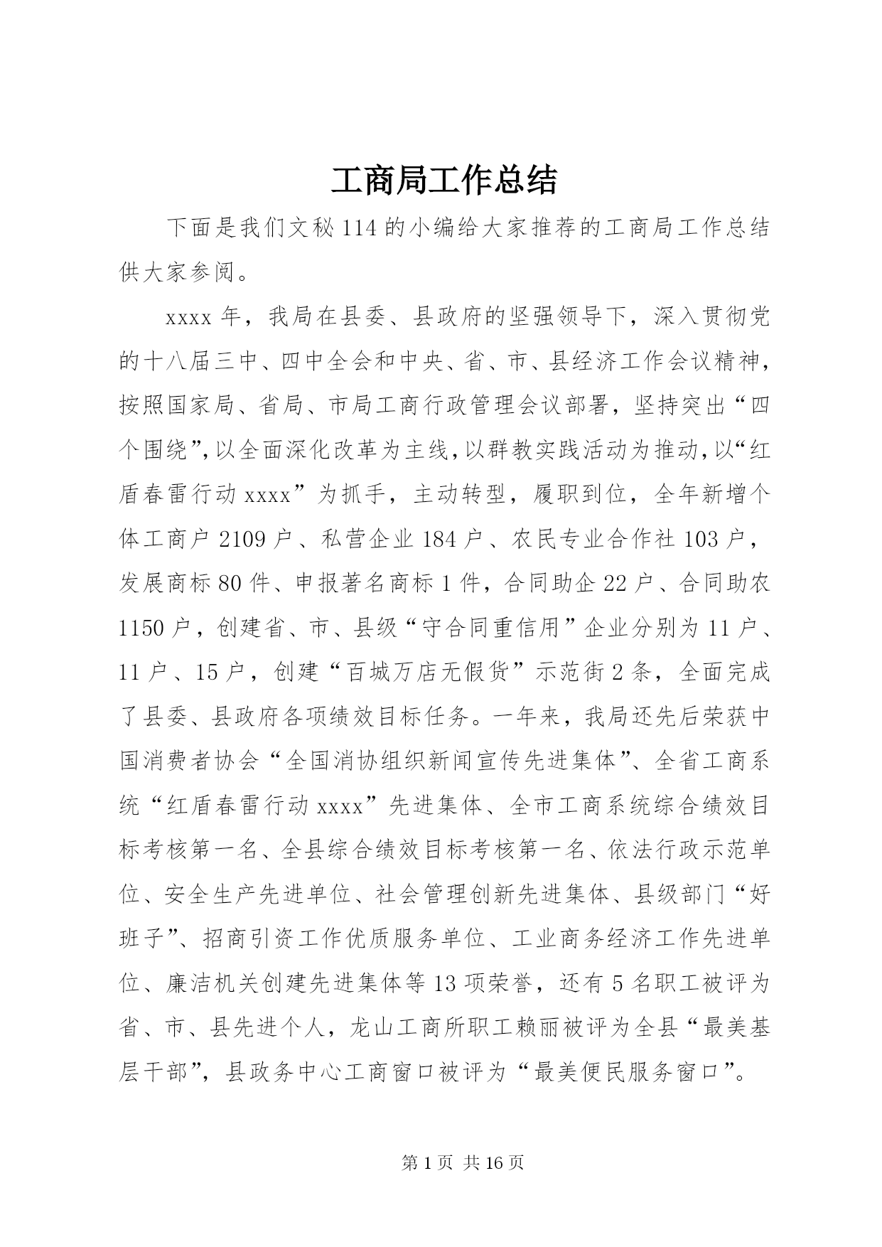 第PAGE\*Arabic\*MERGEFORMAT16页共NUMPAGES\*MERGEFORMAT16页工商局工作总结下面是我们文秘114的小编给大家推荐的工商局工作总结供大家参阅。xxxx年,我局在县委、县政府的坚强领导下,深入贯彻党的十八届三中、四中全会和中央、省、市、县经济工作会议精神,按照国家局、省局、市局工商行政管理会议部署,坚持突出“四个围绕”,以全面深化改革为主线,以群教实践活动为推动,以“红盾春雷行动xxxx”为抓手,主动转型,履职到位,全年新增个体工商户2109户、私营企