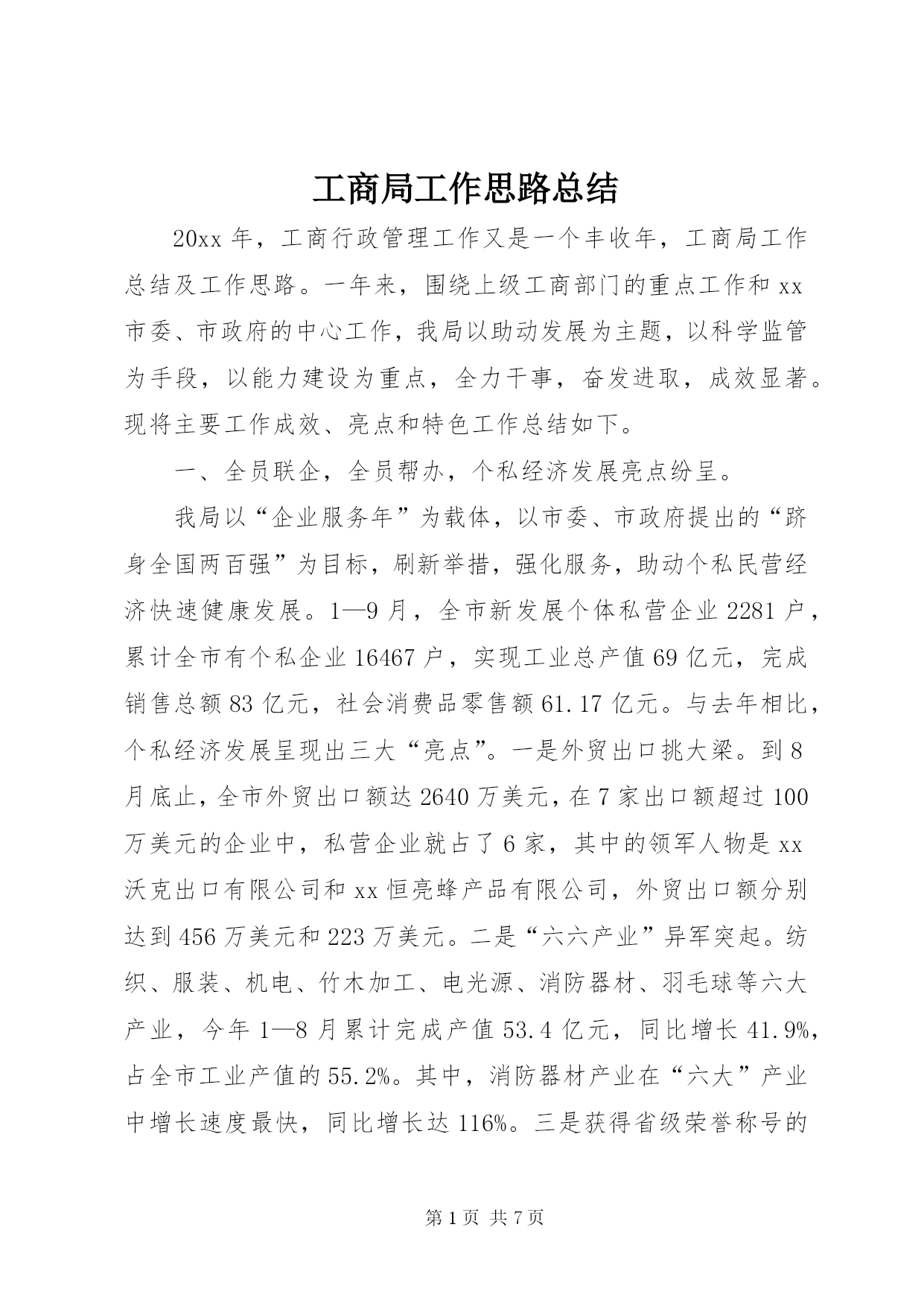 第PAGE\*Arabic\*MERGEFORMAT7页共NUMPAGES\*MERGEFORMAT7页工商局工作思路总结20xx年,工商行政管理工作又是一个丰收年,工商局工作总结及工作思路。一年来,围绕上级工商部门的重点工作和xx市委、市政府的中心工作,我局以助动发展为主题,以科学监管为手段,以能力建设为重点,全力干事,奋发进取,成效显著。现将主要工作成效、亮点和特色工作总结如下。一、全员联企,全员帮办,个私经济发展亮点纷呈。我局以“企业服务年”为载体,以市委、市政府提出的“跻身全国两百强”