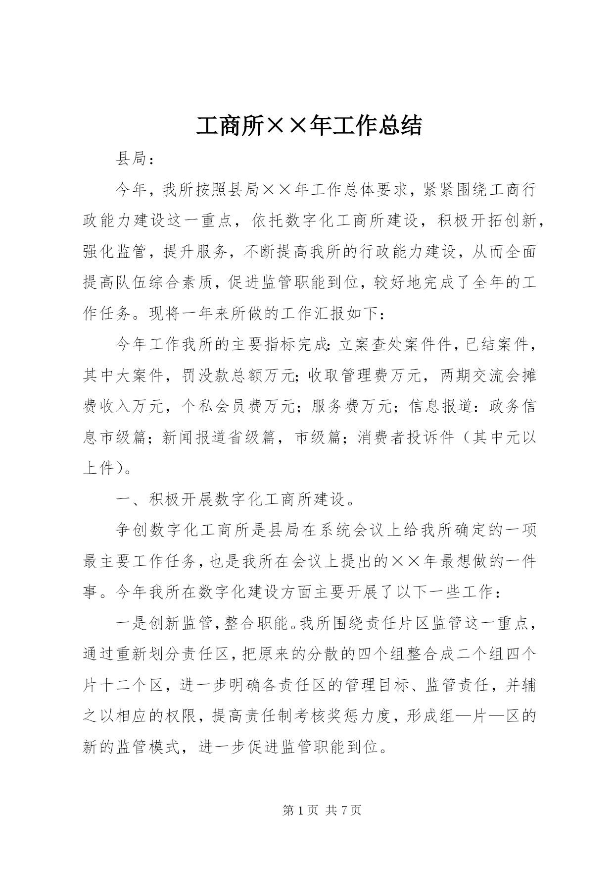 第PAGE\*Arabic\*MERGEFORMAT7页共NUMPAGES\*MERGEFORMAT7页工商所××年工作总结县局:今年,我所按照县局××年工作总体要求,紧紧围绕工商行政能力建设这一重点,依托数字化工商所建设,积极开拓创新,强化监管,提升服务,不断提高我所的行政能力建设,从而全面提高队伍综合素质,促进监管职能到位,较好地完成了全年的工作任务。现将一年来所做的工作汇报如下:今年工作我所的主要指标完成:立案查处案件件,已结案件,其中大案件,罚没款总额万元;收取管理费万元,两期交流会摊