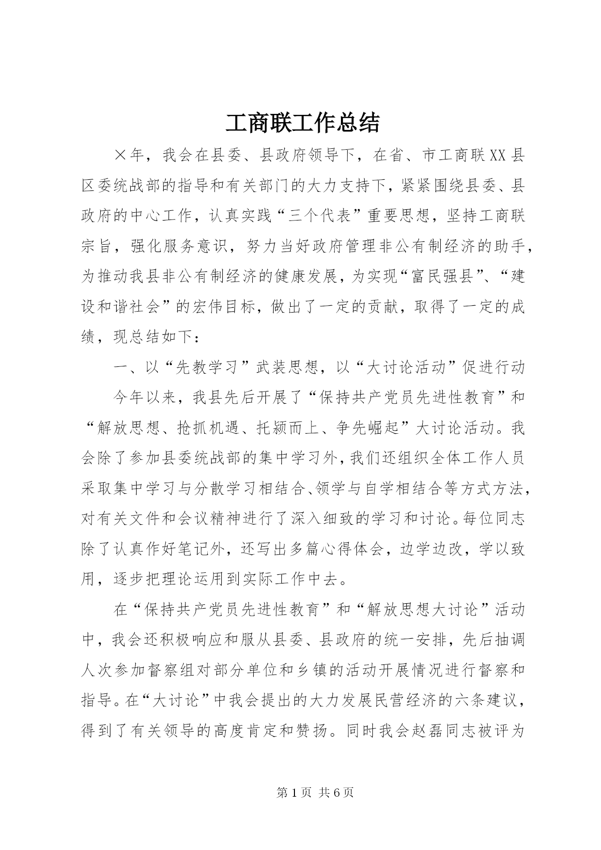 第PAGE\*Arabic\*MERGEFORMAT6页共NUMPAGES\*MERGEFORMAT6页工商联工作总结×年,我会在县委、县政府领导下,在省、市工商联XX县区委统战部的指导和有关部门的大力支持下,紧紧围绕县委、县政府的中心工作,认真实践“三个代表”重要思想,坚持工商联宗旨,强化服务意识,努力当好政府管理非公有制经济的助手,为推动我县非公有制经济的健康发展,为实现“富民强县”、“建设和谐社会”的宏伟目标,做出了一定的贡献,取得了一定的成绩,现总结如下:一、以“先教学习”武装思想,以
