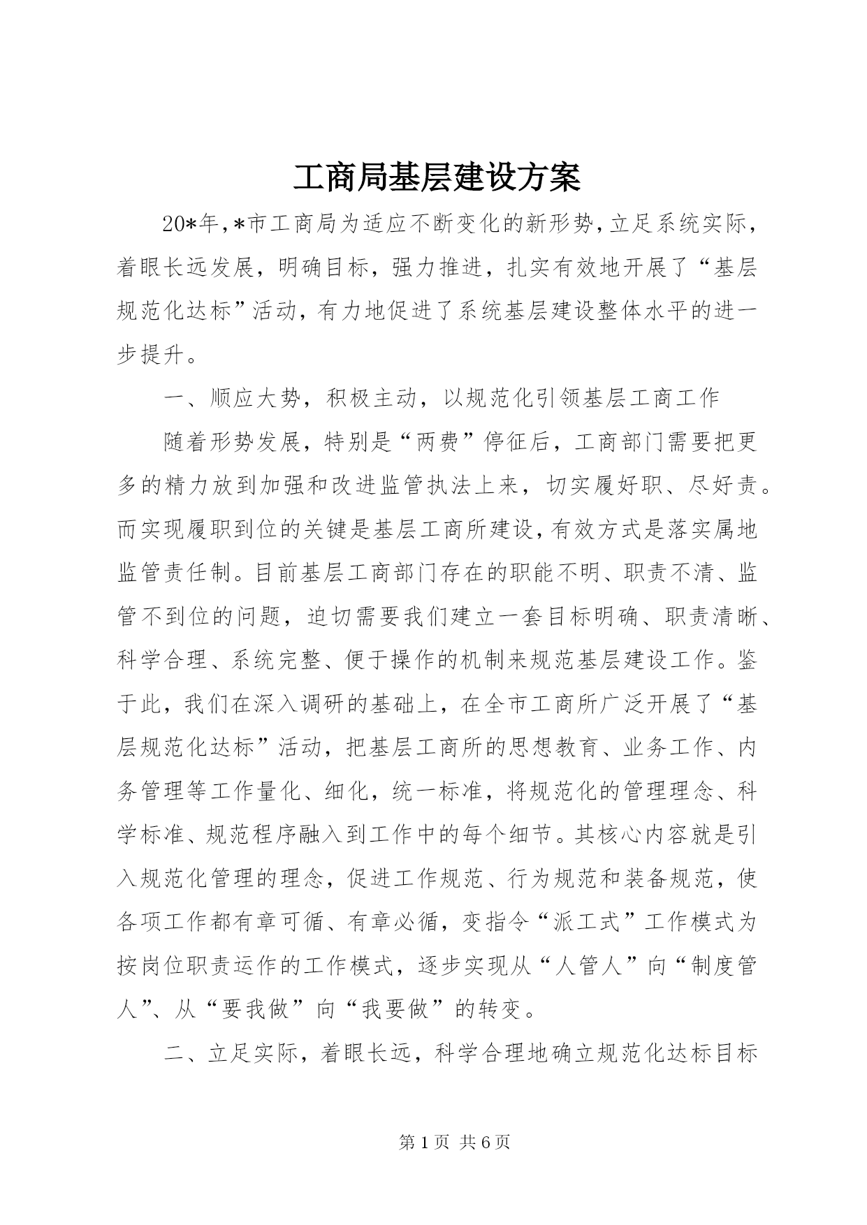 第PAGE\*Arabic\*MERGEFORMAT6页共NUMPAGES\*MERGEFORMAT6页工商局基层建设方案20*年,*市工商局为适应不断变化的新形势,立足系统实际,着眼长远发展,明确目标,强力推进,扎实有效地开展了“基层规范化达标”活动,有力地促进了系统基层建设整体水平的进一步提升。一、顺应大势,积极主动,以规范化引领基层工商工作随着形势发展,特别是“两费”停征后,工商部门需要把更多的精力放到加强和改进监管执法上来,切实履好职、尽好责。而实现履职到位的关键是基层工商所建设,有效