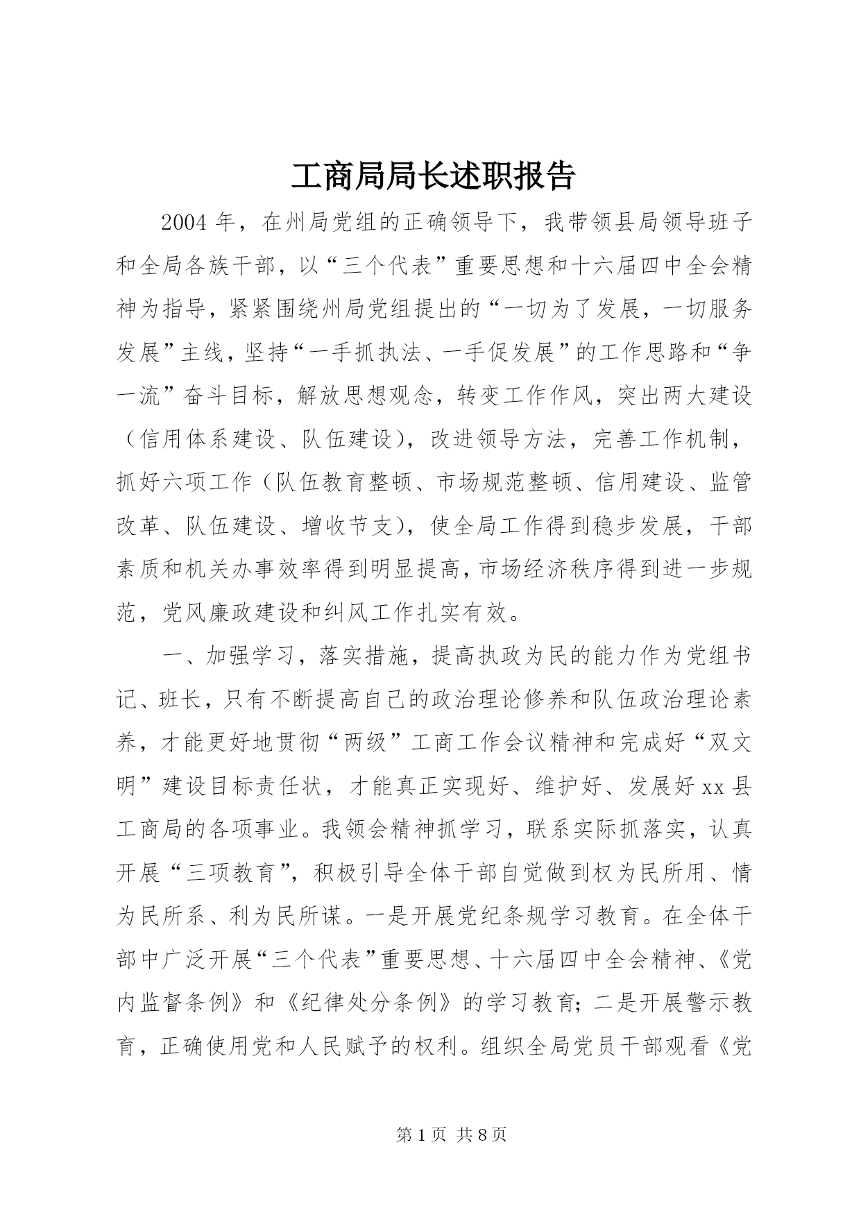 第PAGE\*Arabic\*MERGEFORMAT14页共NUMPAGES\*MERGEFORMAT14页工商局局长述职报告各位领导,同志们:我是xxxx年xx月担任xx工商局局长一职的,x年来,在市工商局及xx县委、县政府的领导下,我始终以“三个代表”为指导,以执政为民为最高标准,紧紧围绕市局提出的“五抓”,全力以赴的开展各项工作。通过不懈的努力,社会各界和人民群众对工商部门的满意不断上升,各项工作都取得了较好成绩。我所做的主要工作:一、提高队伍素质,增强行政能力针对干部队伍实际情况,我以
