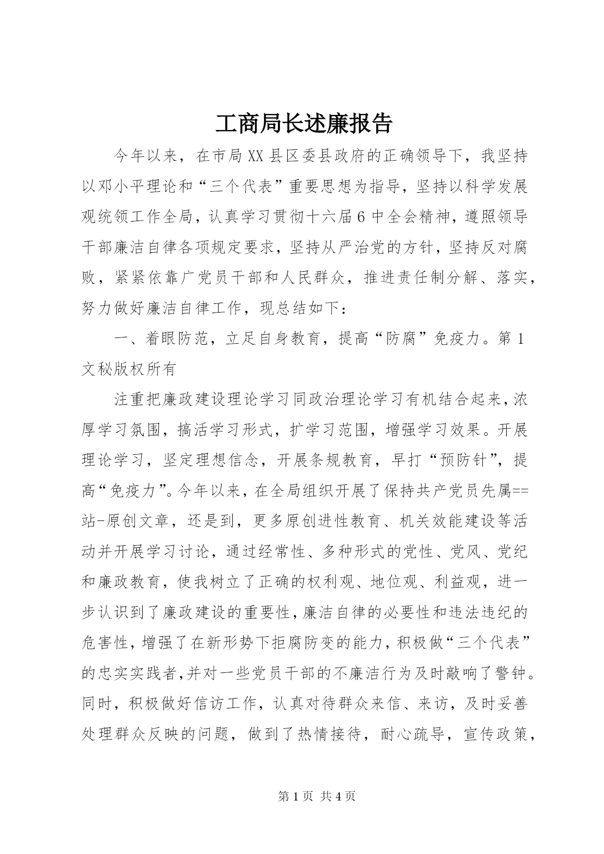 第PAGE\*Arabic\*MERGEFORMAT4页共NUMPAGES\*MERGEFORMAT4页工商局长述廉报告今年以来,在市局XX县区委县政府的正确领导下,我坚持以邓小平理论和“三个代表”重要思想为指导,坚持以科学发展观统领工作全局,认真学习贯彻十六届6中全会精神,遵照领导干部廉洁自律各项规定要求,坚持从严治党的方针,坚持反对腐败,紧紧依靠广党员干部和人民群众,推进责任制分解、落实,努力做好廉洁自律工作,现总结如下:一、着眼防范,立足自身教育,提高“防腐”免疫力。第1文秘版权所有注重