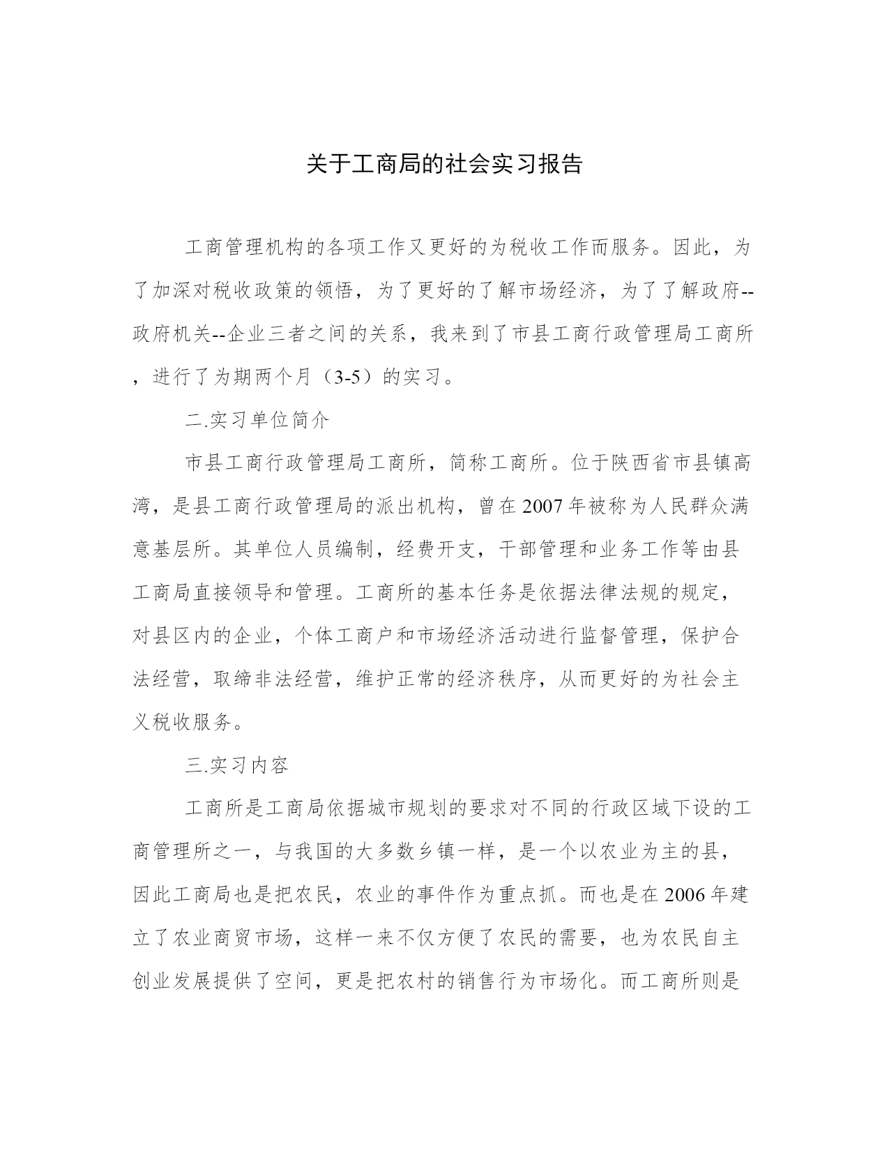 关于工商局的社会实习报告工商管理机构的各项工作又更好的为税收工作而服务。因此,为了加深对税收政策的领悟,为了更好的了解市场经济,为了了解政府--政府机关--企业三者之间的关系,我来到了市县工商行政管理局工商所,进行了为期两个月(3-5)的实习。二.实习单位简介市县工商行政管理局工商所,简称工商所。位于陕西省市县镇高湾,是县工商行政管理局的派出机构,曾在2007年被称为人民群众满意基层所。其单位人员编制,经费开支,干部管理和业务工作等由县工商局直接领导和管理。工商所的基本任务是依据法律法规的规定,对县区内的