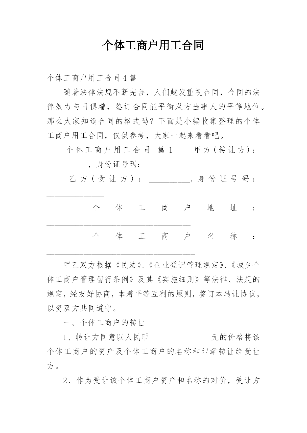 个体工商户用工合同个体工商户用工合同4篇随着法律法规不断完善,人们越发重视合同,合同的法律效力与日俱增,签订合同能平衡双方当事人的平等地位。那么大家知道合同的格式吗?下面是小编收集整理的个体工商户用工合同,仅供参考,大家一起来看看吧。个体工商户用工合同篇1甲方(转让方):__________,身份证号码:________________乙方(受让方):__________,身份证号码:______________个体工商户地址:___________________________________个体工商