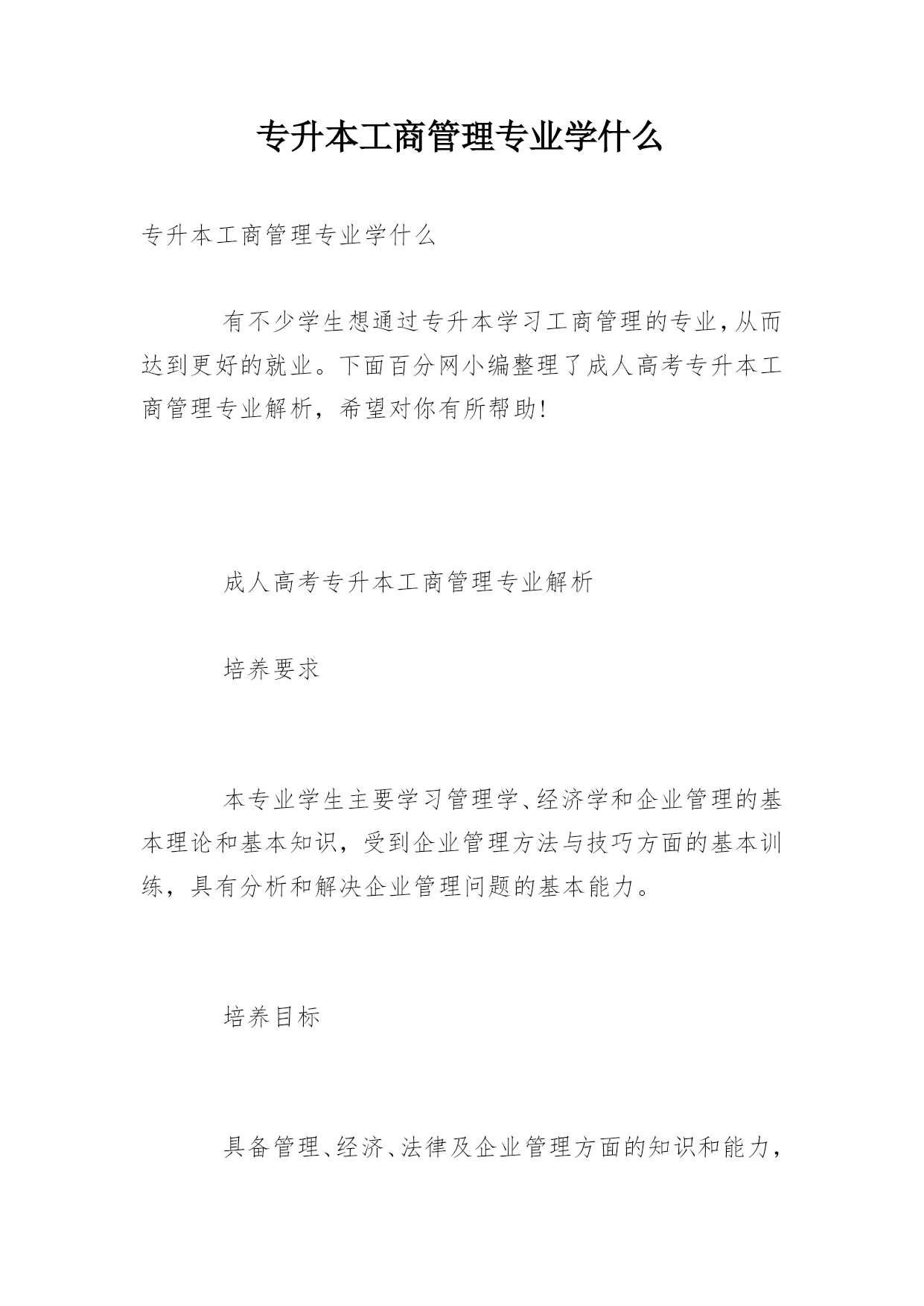 专升本工商管理专业学什么专升本工商管理专业学什么有不少学生想通过专升本学习工商管理的专业,从而达到更好的就业。下面百分网小编整理了成人高考专升本工商管理专业解析,希望对你有所帮助!成人高考专升本工商管理专业解析培养要求本专业学生主要学习管理学、经济学和企业管理的基本理论和基本知识,受到企业管理方法与技巧方面的基本训练,具有分析和解决企业管理问题的基本能力。培养目标具备管理、经济、法律及企业管理方面的知识和能力,能在企、事业单位及政府部门从事管理以及教学、科研方面工作的工商管理学科高级专门人才。毕业生应获得