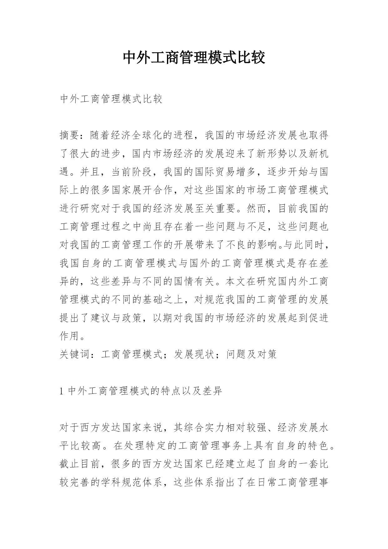 中外工商管理模式比较中外工商管理模式比较摘要:随着经济全球化的进程,我国的市场经济发展也取得了很大的进步,国内市场经济的发展迎来了新形势以及新机遇。并且,当前阶段,我国的国际贸易增多,逐步开始与国际上的很多国家展开合作,对这些国家的市场工商管理模式进行研究对于我国的经济发展至关重要。然而,目前我国的工商管理过程之中尚且存在着一些问题与不足,这些问题也对我国的工商管理工作的开展带来了不良的影响。与此同时,我国自身的工商管理模式与国外的工商管理模式是存在差异的,这些差异与不同的国情有关。本文在研究国内外工商管