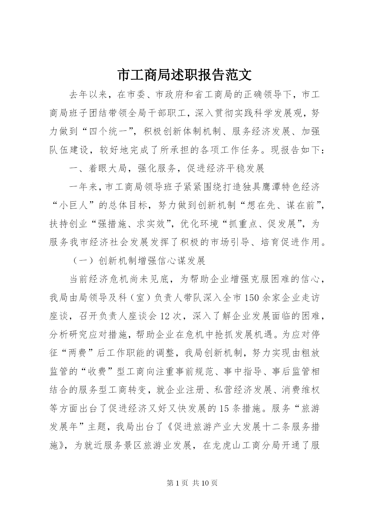 第PAGE\*Arabic\*MERGEFORMAT10页共NUMPAGES\*MERGEFORMAT10页市工商局述职报告范文去年以来,在市委、市政府和省工商局的正确领导下,市工商局班子团结带领全局干部职工,深入贯彻实践科学发展观,努力做到“四个统一”,积极创新体制机制、服务经济发展、加强队伍建设,较好地完成了所承担的各项工作任务。现报告如下:一、着眼大局,强化服务,促进经济平稳发展一年来,市工商局领导班子紧紧围绕打造独具鹰潭特色经济“小巨人”的总体目标,努力做到创新机制“想在先、谋在前”,