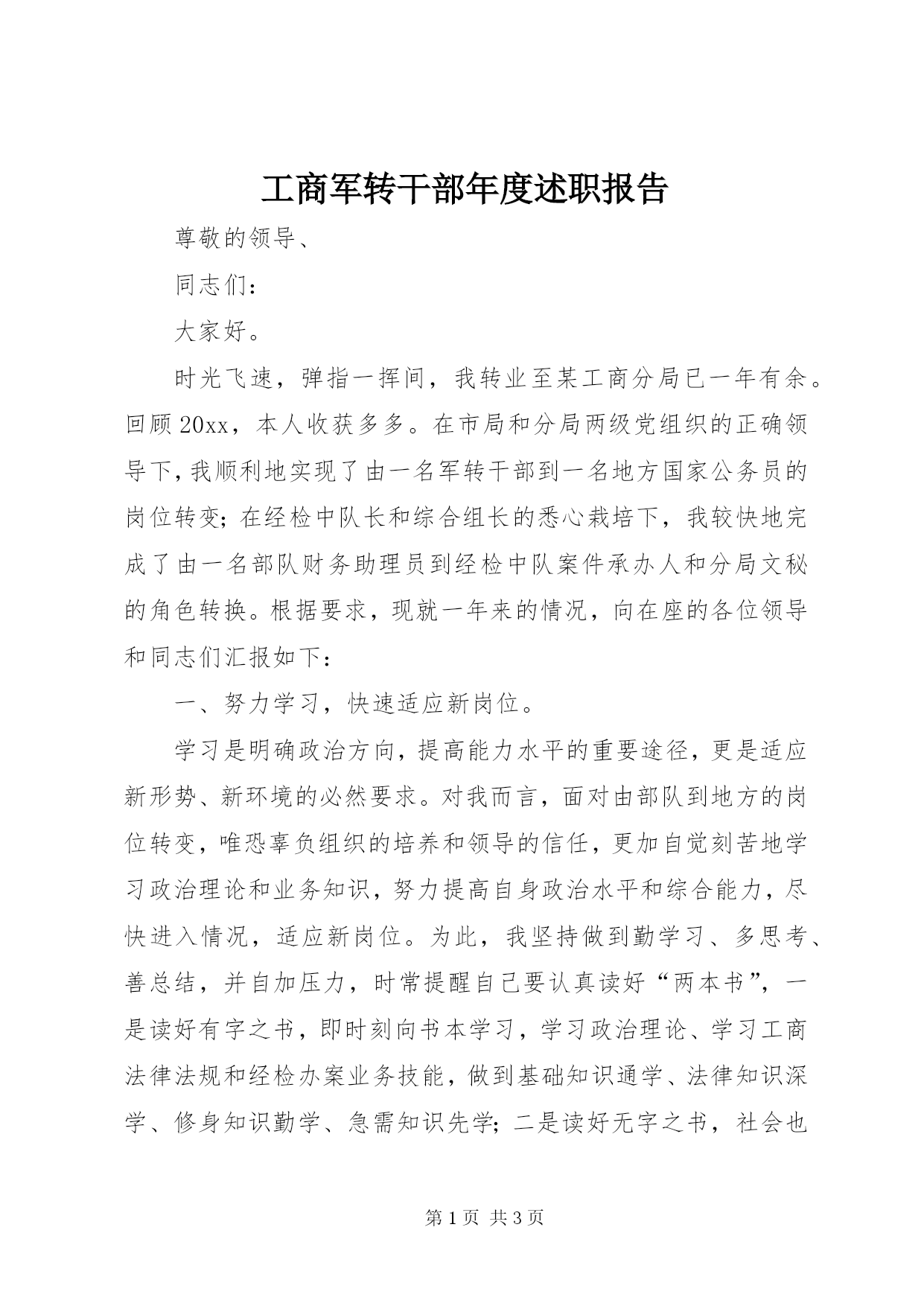 第PAGE\*Arabic\*MERGEFORMAT3页共NUMPAGES\*MERGEFORMAT3页工商军转干部年度述职报告尊敬的领导、同志们:大家好。时光飞速,弹指一挥间,我转业至某工商分局已一年有余。回顾20xx,本人收获多多。在市局和分局两级党组织的正确领导下,我顺利地实现了由一名军转干部到一名地方国家公务员的岗位转变;在经检中队长和综合组长的悉心栽培下,我较快地完成了由一名部队财务助理员到经检中队案件承办人和分局文秘的角色转换。根据要求,现就一年来的情况,向在座的各位领导和同志们汇