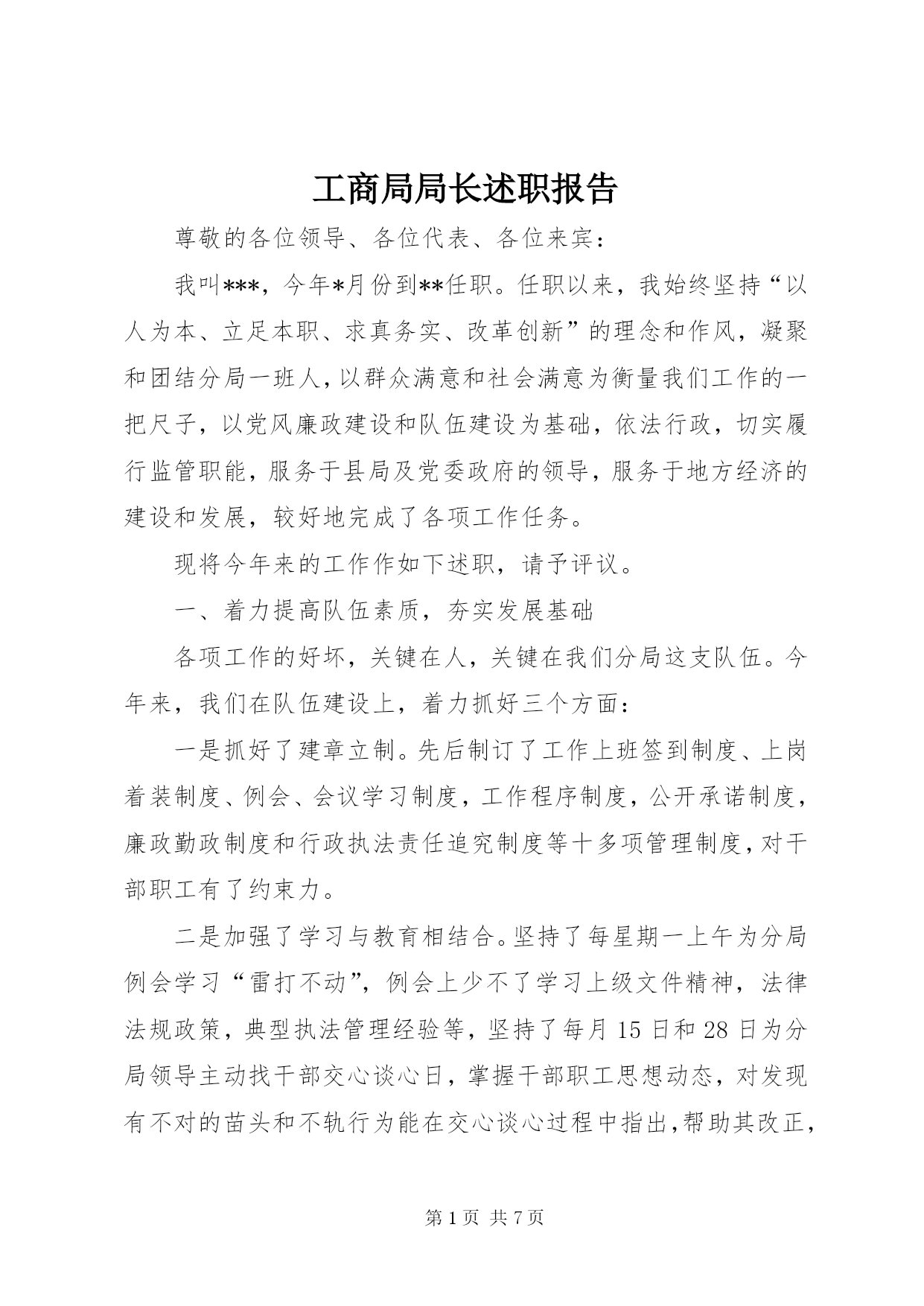 第PAGE\*Arabic\*MERGEFORMAT7页共NUMPAGES\*MERGEFORMAT7页工商局局长述职报告尊敬的各位领导、各位代表、各位来宾:我叫***,今年*月份到**任职。任职以来,我始终坚持“以人为本、立足本职、求真务实、改革创新”的理念和作风,凝聚和团结分局一班人,以群众满意和社会满意为衡量我们工作的一把尺子,以党风廉政建设和队伍建设为基础,依法行政,切实履行监管职能,服务于县局及党委政府的领导,服务于地方经济的建设和发展,较好地完成了各项工作任务。现将今年来的工作作如