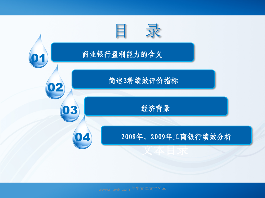 目录一揽子计划三、简述3种绩效评价指标四、对工商银行的绩效分析表2中国工商银行2008-2009年传统财务指标值盈利性指标—ROE盈利性指标—ROA盈利性指标—NIM那么利息支出增长的来源是什么呢?谢谢观看