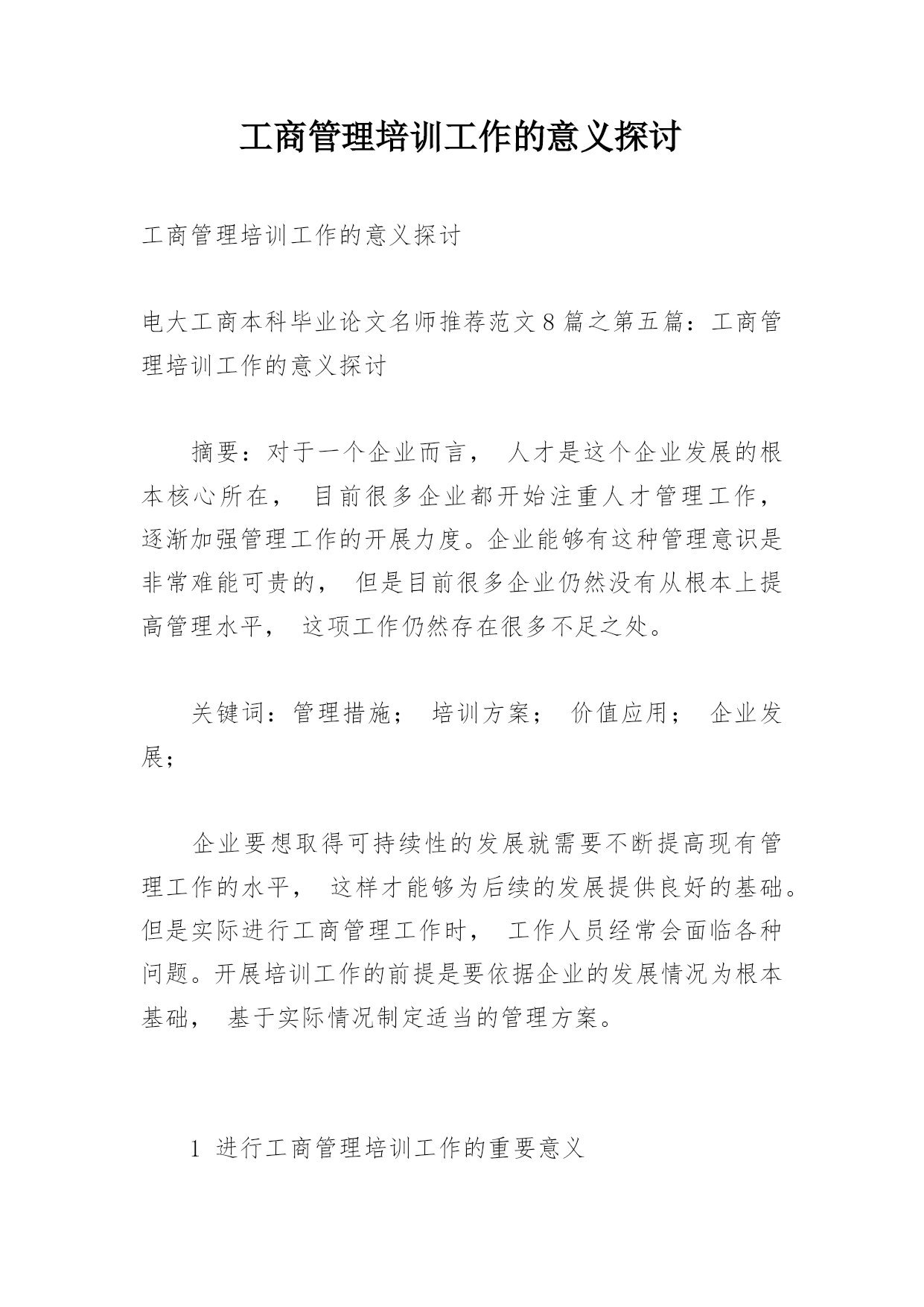工商管理培训工作的意义探讨工商管理培训工作的意义探讨电大工商本科毕业论文名师推荐范文8篇之第五篇:工商管理培训工作的意义探讨摘要:对于一个企业而言,人才是这个企业发展的根本核心所在,目前很多企业都开始注重人才管理工作,逐渐加强管理工作的开展力度。企业能够有这种管理意识是非常难能可贵的,但是目前很多企业仍然没有从根本上提高管理水平,这项工作仍然存在很多不足之处。关键词:管理措施;培训方案;价值应用;企业发展;企业要想取得可持续性的发展就需要不断提高现有管理工作的水平,这样才能够为后续的发展提供良好的基础。但