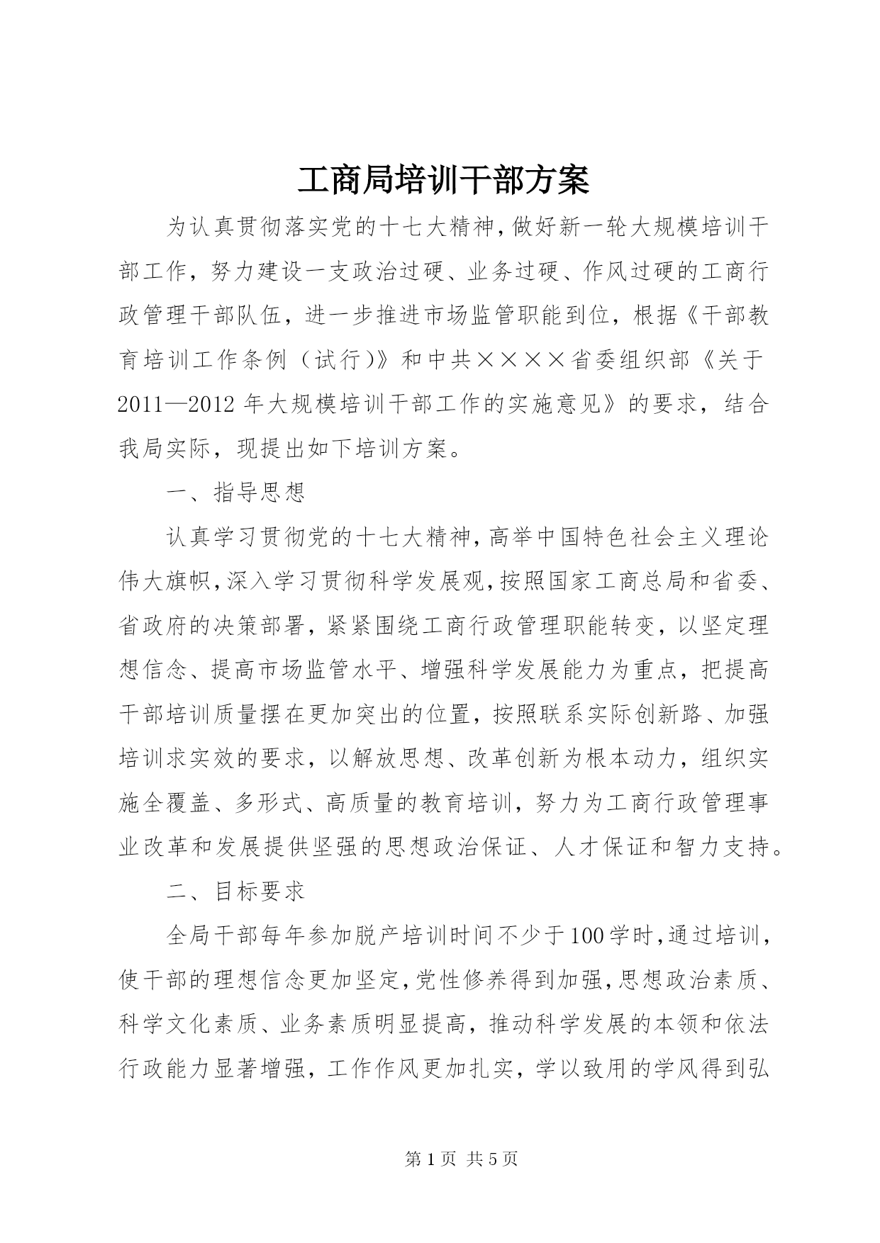 第PAGE\*Arabic\*MERGEFORMAT5页共NUMPAGES\*MERGEFORMAT5页工商局培训干部方案为认真贯彻落实党的十七大精神,做好新一轮大规模培训干部工作,努力建设一支政治过硬、业务过硬、作风过硬的工商行政管理干部队伍,进一步推进市场监管职能到位,根据《干部教育培训工作条例(试行)》和中共××××省委组织部《关于2011—2012年大规模培训干部工作的实施意见》的要求,结合我局实际,现提出如下培训方案。一、指导思想认真学习贯彻党的十七大精神,高举中国特色社会主义理论伟