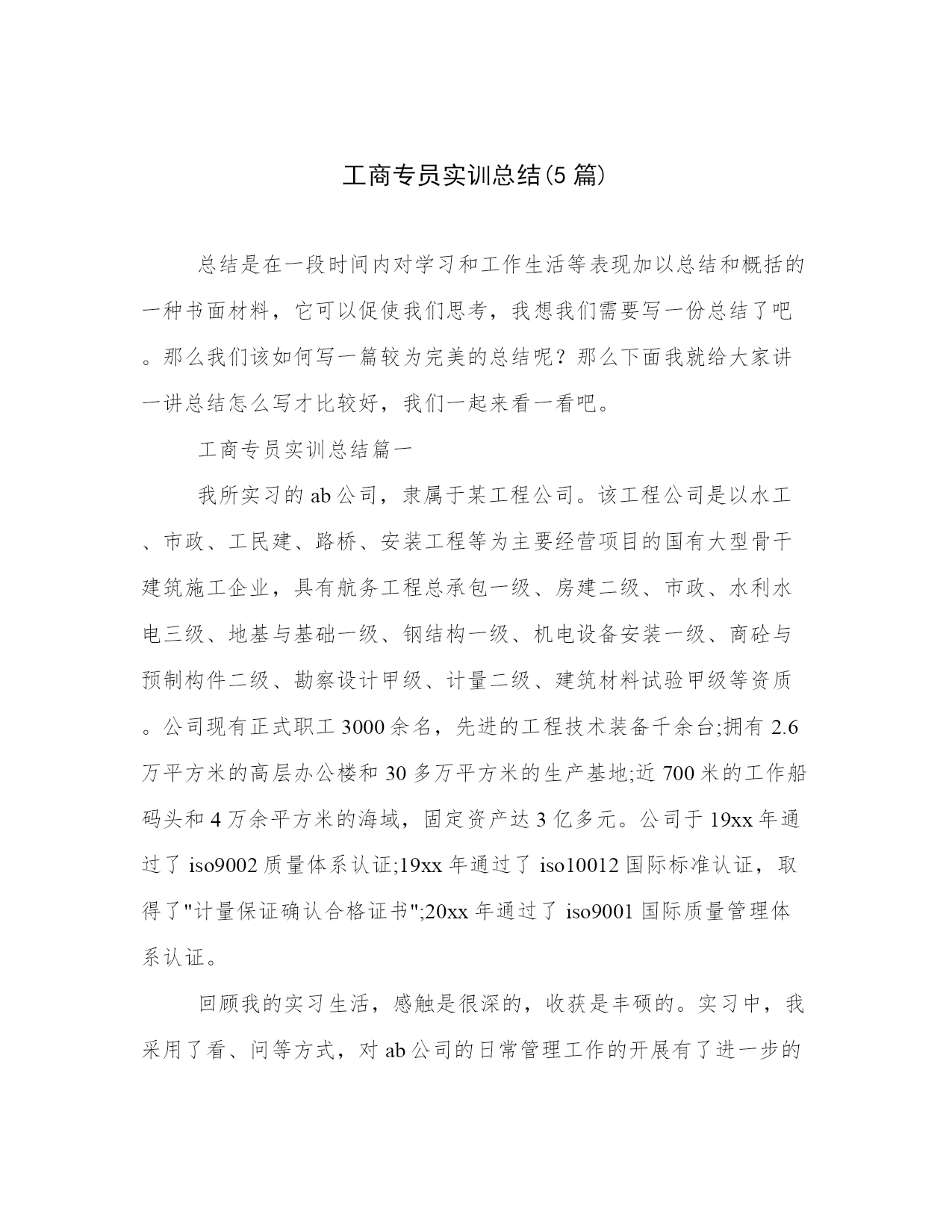 工商专员实训总结(5篇)总结是在一段时间内对学习和工作生活等表现加以总结和概括的一种书面材料,它可以促使我们思考,我想我们需要写一份总结了吧。那么我们该如何写一篇较为完美的总结呢?那么下面我就给大家讲一讲总结怎么写才比较好,我们一起来看一看吧。工商专员实训总结篇一我所实习的ab公司,隶属于某工程公司。该工程公司是以水工、市政、工民建、路桥、安装工程等为主要经营项目的国有大型骨干建筑施工企业,具有航务工程总承包一级、房建二级、市政、水利水电三级、地基与基础一级、钢结构一级、机电设备安装一级、商砼与预制构件二