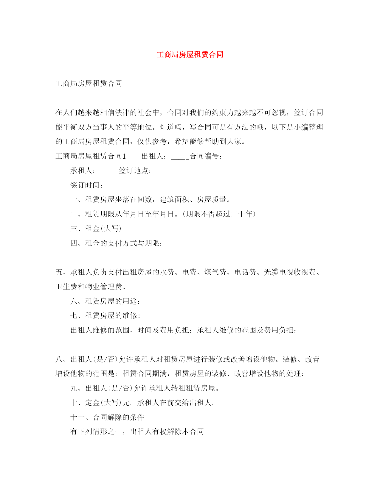 此资料由网络收集而来,如有侵权请告知上传者立即删除。资料共分享,我们负责传递知识。工商局房屋租赁合同工商局房屋租赁合同在人们越来越相信法律的社会中,合同对我们的约束力越来越不可忽视,签订合同能平衡双方当事人的平等地位。知道吗,写合同可是有方法的哦,以下是小编整理的工商局房屋租赁合同,仅供参考,希望能够帮助到大家。工商局房屋租赁合同1出租人:_____合同编号:承租人:_____签订地点:签订时间:一、租赁房屋坐落在间数,建筑面积、房屋质量。二、租赁期限从年月日至年月日。(期限不得超过二十年)三、租金(大写